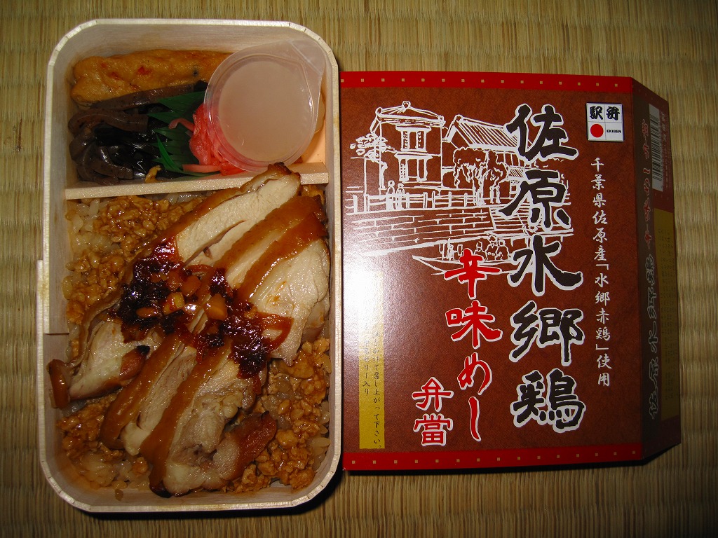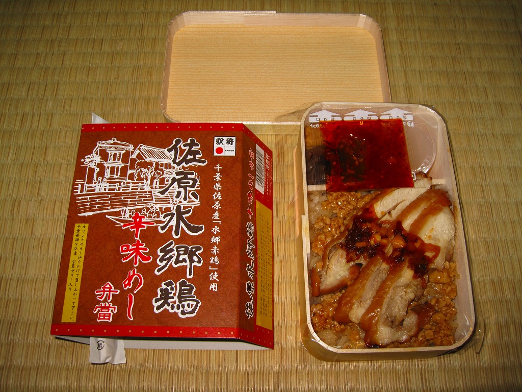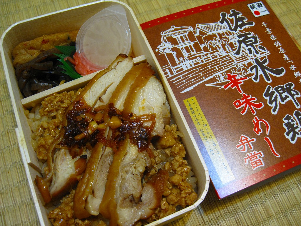 秋冬の駅弁大会シーズンに向けた、2010(平成22)年秋の新商品。手のひらサイズの経木枠の容器を、商品名と佐原の建物を描いたボール紙の枠にはめる。中身は鶏ガラスープの炊込飯の上に粒の大きい千葉県佐原市のブランド鶏「水郷赤鶏」の鶏そぼろを敷き、同じくその鶏照焼を3切れ並べてタレをかけ、がんもどき、こんにゃく、サツマイモ茎佃煮、梨葛ゼリーを添えるもの。別添のオリジナルラー油をかけて食べることを推奨する、2010年に流行した「食べるラー油」の要素を取り入れた、濃厚濃縮な鶏そぼろ照焼丼。コンパクトなのに下げ底で分量も重量もある。このシーズンのみの販売だった模様。