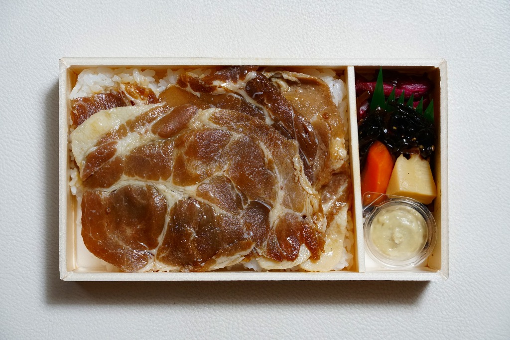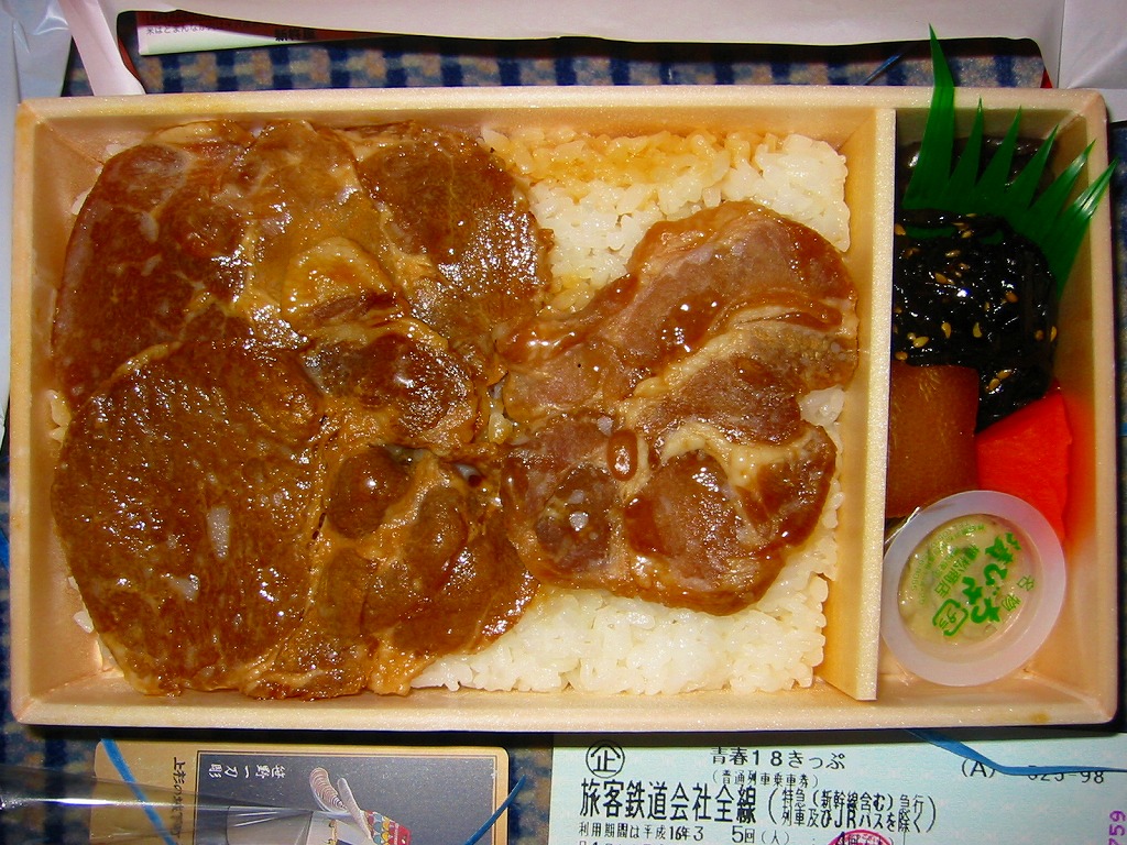 2009(平成21)年9月に発売か。黒いトレーを接着した長方形の容器に透明なふたをして、輪ゴムで留めてから中身の写真を印刷したボール紙の枠にはめる。中身は白御飯の上にタマネギとニンジンの炒め物を敷き、豚ロース肉の味噌漬け焼きを1枚のっそり載せて、ほうれん草のピーナツ和え、鉄砲漬、赤かぶ漬、ラッキョウを添えるもの。中身が常温でも、パッケージの絵柄も含めて熱さを感じる駅弁。価格は2009年の購入時で850円、2015年時点で880円、2015年7月から900円。2020年の春頃に、ひっそりと終売か。