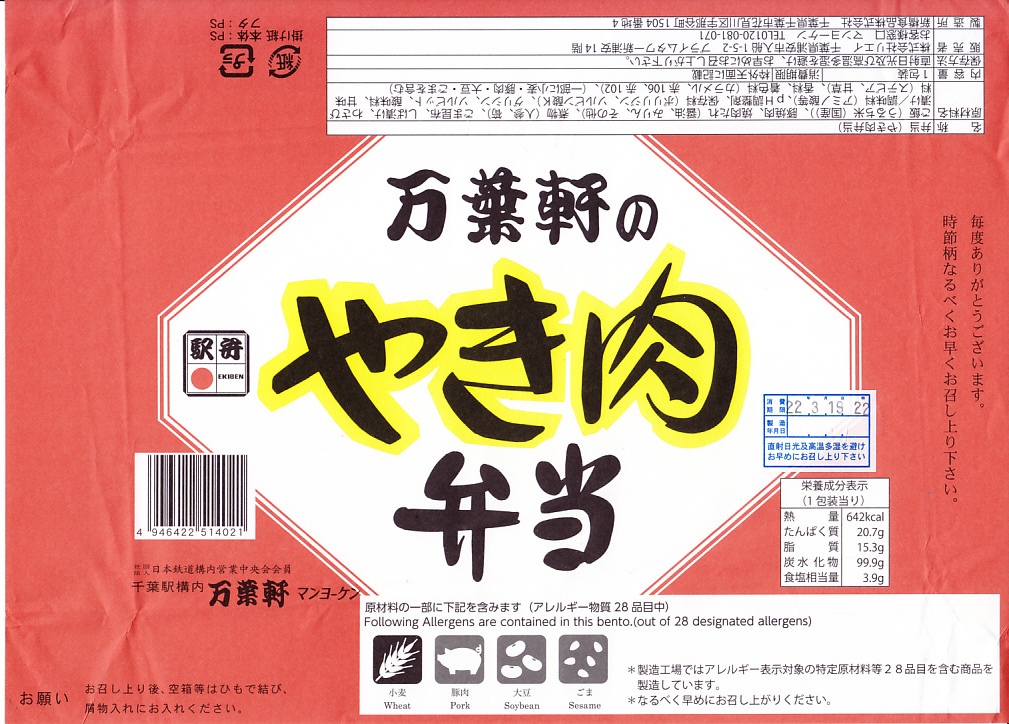 2009(平成21)年11月18日に発売。黒いトレーを接着した容器に透明なふたをして、商品名とタレントやその経営店の写真を印刷したボール紙の枠にはめる。中身は白御飯の上を牛カルビの焼肉で覆い、大豆ともやしとホウレンソウのナムルを添えるもの。つまり韓国風焼肉弁当。同じジャンルの東京駅弁「叙々苑特製焼肉弁当」の価格と品質を半分にした感じ。千葉駅に加えて成田空港や羽田空港のANA系売店「ANAFESTA」でも販売され、駅弁催事にもよく出てきた。2年間くらい販売した模様。