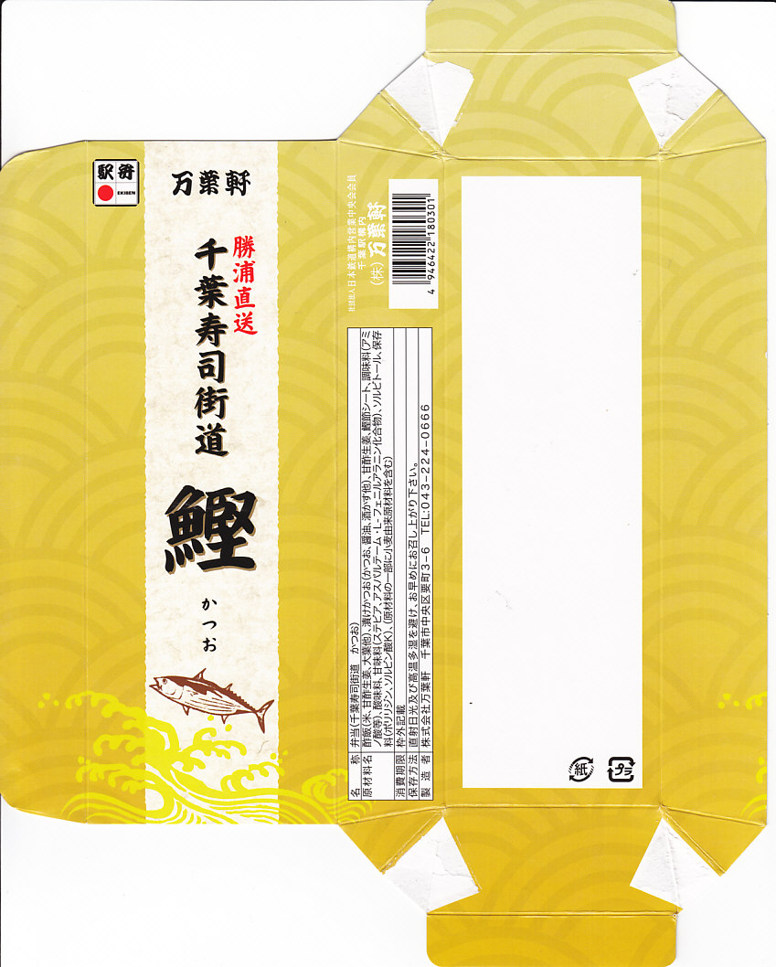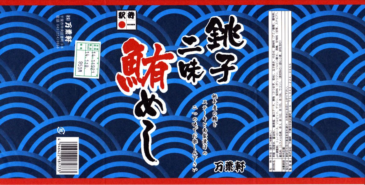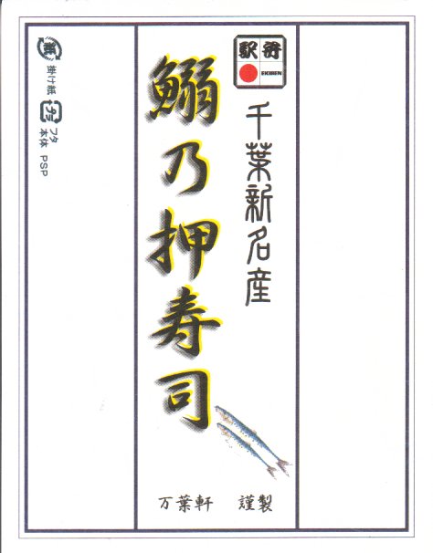 使われた時期がまったく分からない、昔の千葉駅弁の掛紙。上記の駅弁「鰯乃押寿司」の、2004年11月のものと同じ。リサイクル識別表示があるから2001年以降のものだろうが、調製印がない、食品表示もない、特徴的な絵柄もない、価格もないでは、もうお手上げ。