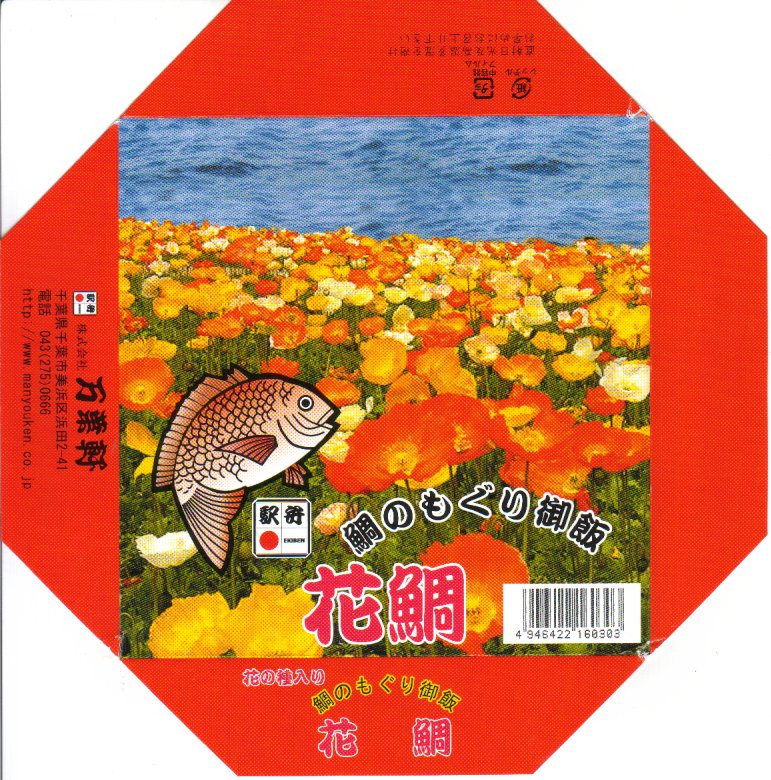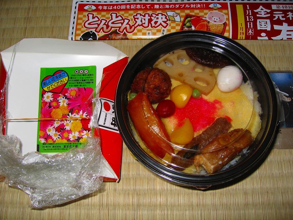 2004(平成16)年12月22日に発売。底や側面に穴が開く白い陶器に、花いっぱいな柄の掛紙をかけて、丸ごとラップで包む。中身は黒いプラ製カップに入っており、鯛の炊き込み御飯の上を薄焼き卵で覆い、鯛の佐倉味噌焼や姫筍の豚巻きや鰯団子などを添える。