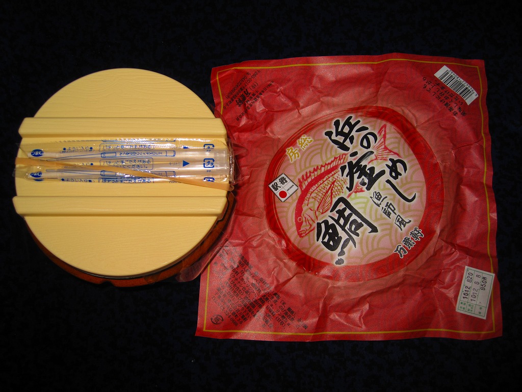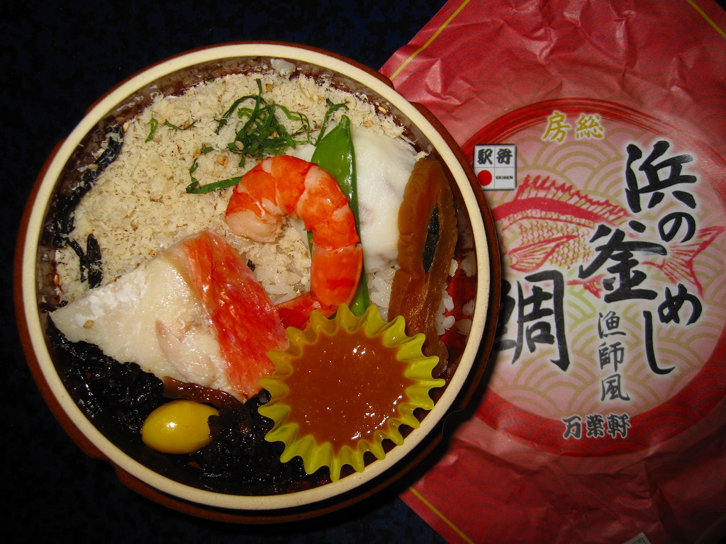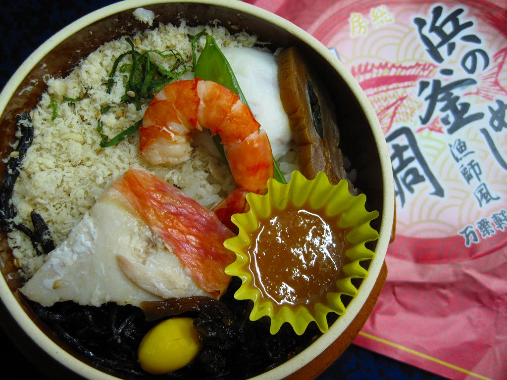 2013(平成25)年の春頃の発売か。中身はつまり鯛飯で、茶飯をタイのそぼろで覆い、マグロ煮、イワシ棒天、イカ団子、玉子焼などを添えるもの。容器が貧弱に柔らかかったり、飯がボロボロと食べにくかったり、つくりのチープさが気になったが、それでも一食として過不足ない具と量は備えていた。2016年までの販売か。