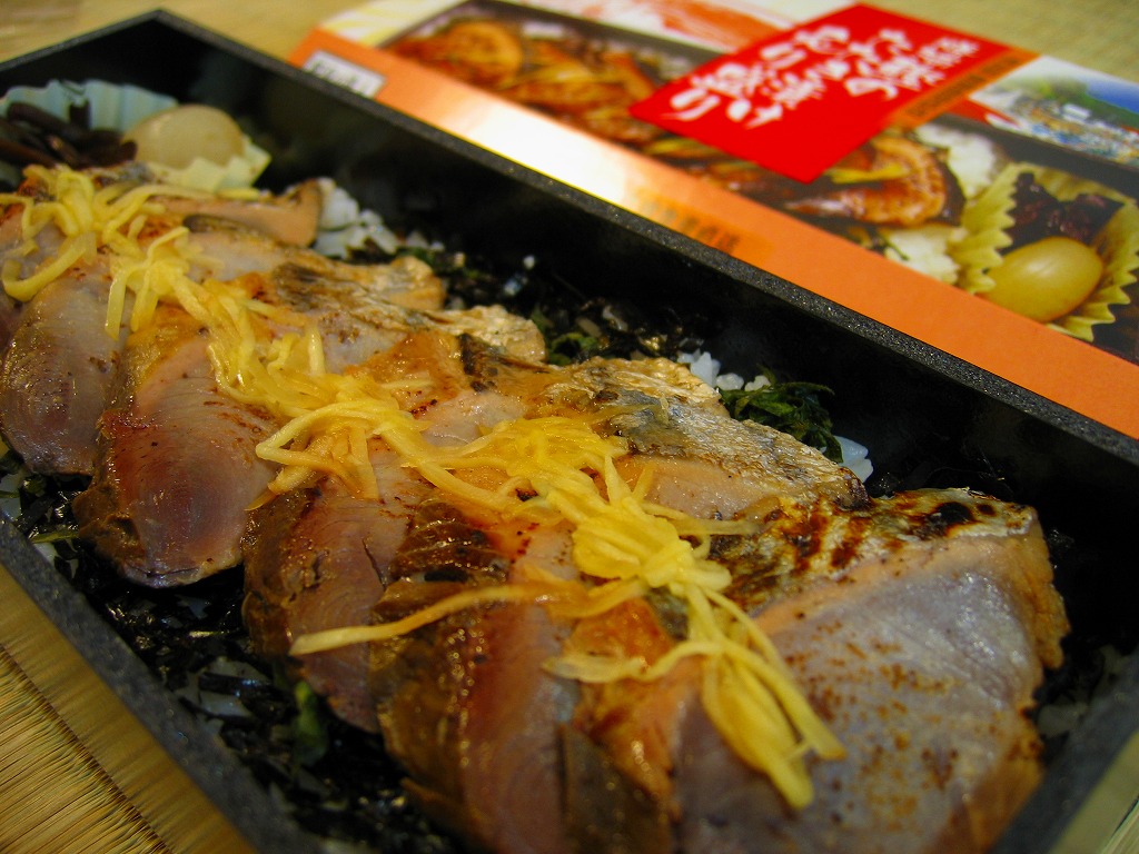 2010(平成22)年5月までに発売か。従前の類似品を統合したのか、アジ、タイ、サンマ、イワシとこのカツオで5種のシリーズを組んでいる。こちらは甘酢生姜と大葉を混ぜた円筒状の酢飯に、カツオのヅケとカツオブシシートを半周以上巻き付けて、ビニールで巻いてから笹の葉の上に置き、駅弁の名前を書いた専用の小さなボール紙箱に収めるもの。クセのない旨味を少量安価に凝縮した、帰り道にお手軽な駅弁。2011年度限りで終売か。
