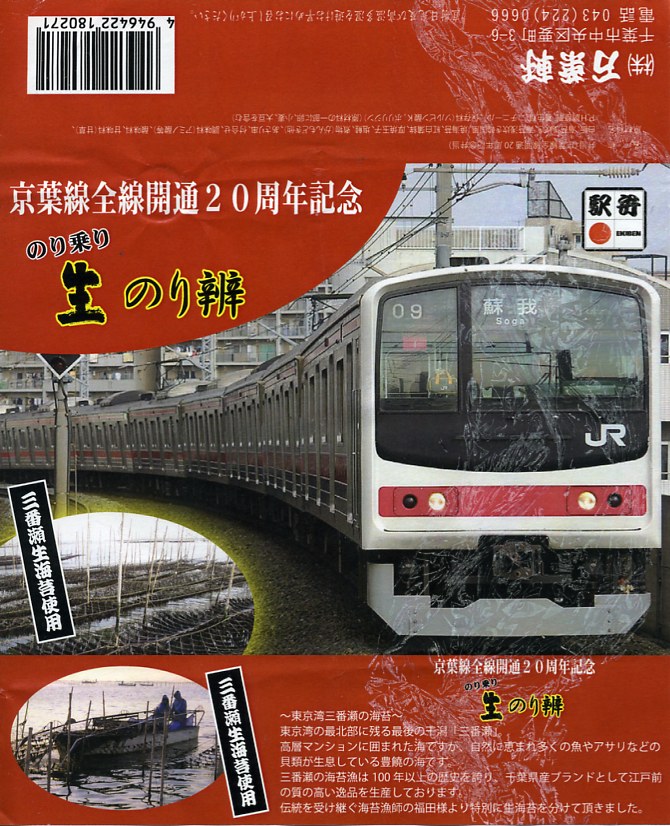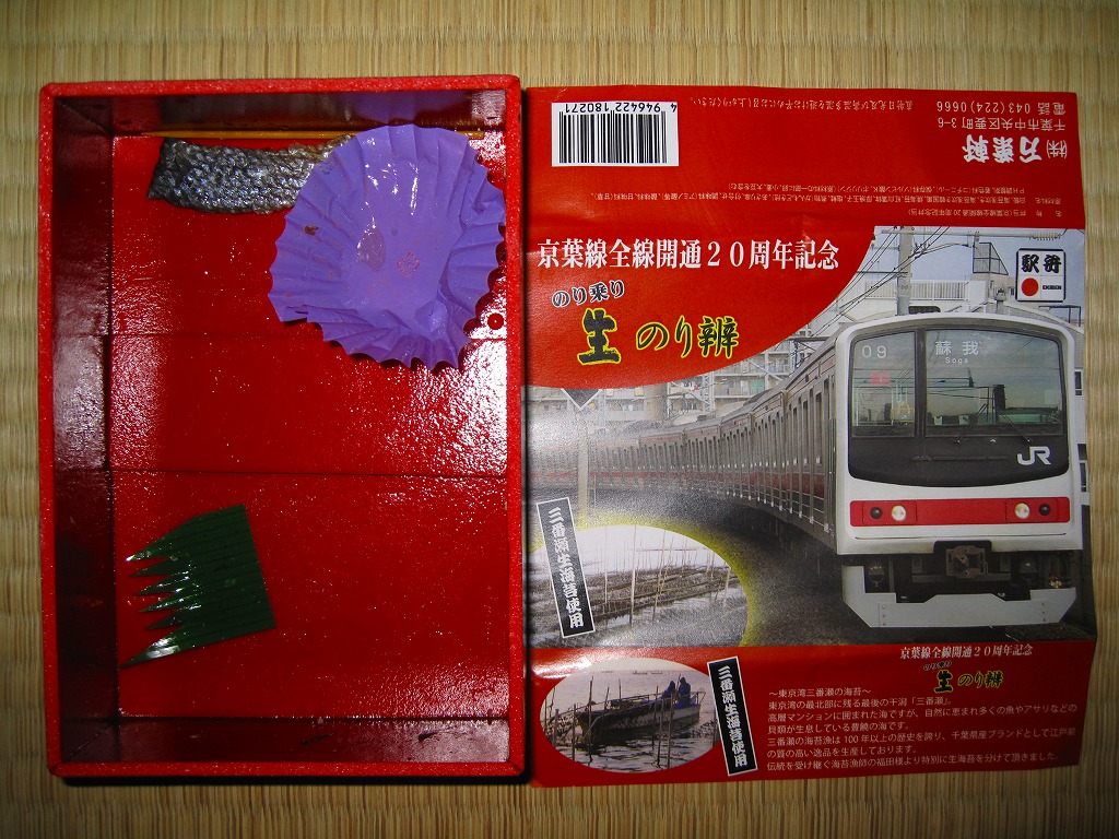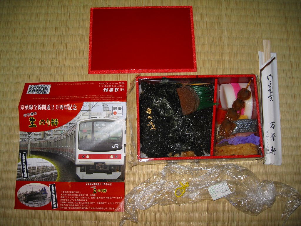 JR京葉線の全線開通20周年を記念して、2010(平成22)年3月10日から4月頃まで販売された記念駅弁。こうやって東京駅の第11回東日本縦断駅弁大会でも販売された。黒塗りの容器に、京葉線の通勤電車の写真を載せた赤い掛紙を巻き、ラップで包む。中身は白御飯の上に鰹節をまぶし、三番瀬で獲れたという海苔を浅炊き、浅炊き韓国風、焼海苔の3種で覆い、アサリ串、熱い紅白のカマボコ、玉子焼、鮭塩焼、がんもどき、タクアンなどを添えるもの。