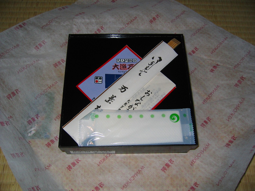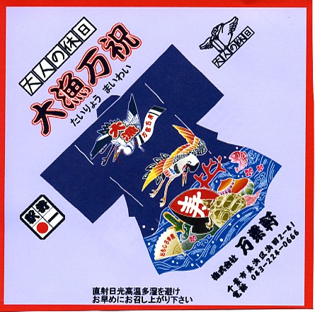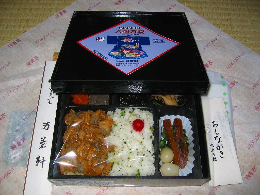 珍しく1業者で2種類も出す、千葉駅版の「大人の休日」駅弁のもうひとつ。木製のような触感と強度があるボール紙製のフタ付き長方形の容器に、柄はともかく印刷はインクジェットプリンタのちょっとチープな掛紙を貼り、和紙風の風呂敷で包んで高級感を出す。中身はアサリ御飯と高菜の日の丸御飯、鯛の佐倉味噌焼、トコブシやサザエやヒジキ、カボチャやタケノコなどの煮物など。趣味的には掛紙の改善により、容器や包装や内容や風味で演じる高級感がより生きると思う。価格は2005年の購入時で1,200円、2015年時点で1,300円、後に1,500円、2019年10月から1,600円。2017年時点で下記のとおり、接頭辞を外した「大漁万祝」として、エキナカで売られていた模様。2020年の春頃までに、ひっそりと終売か。