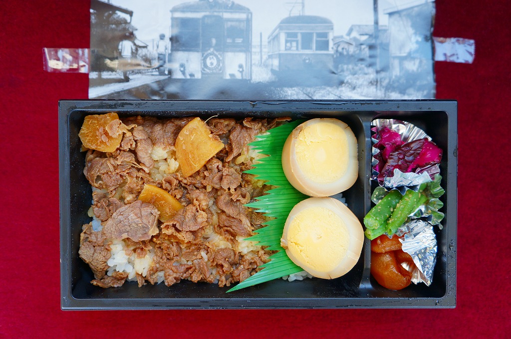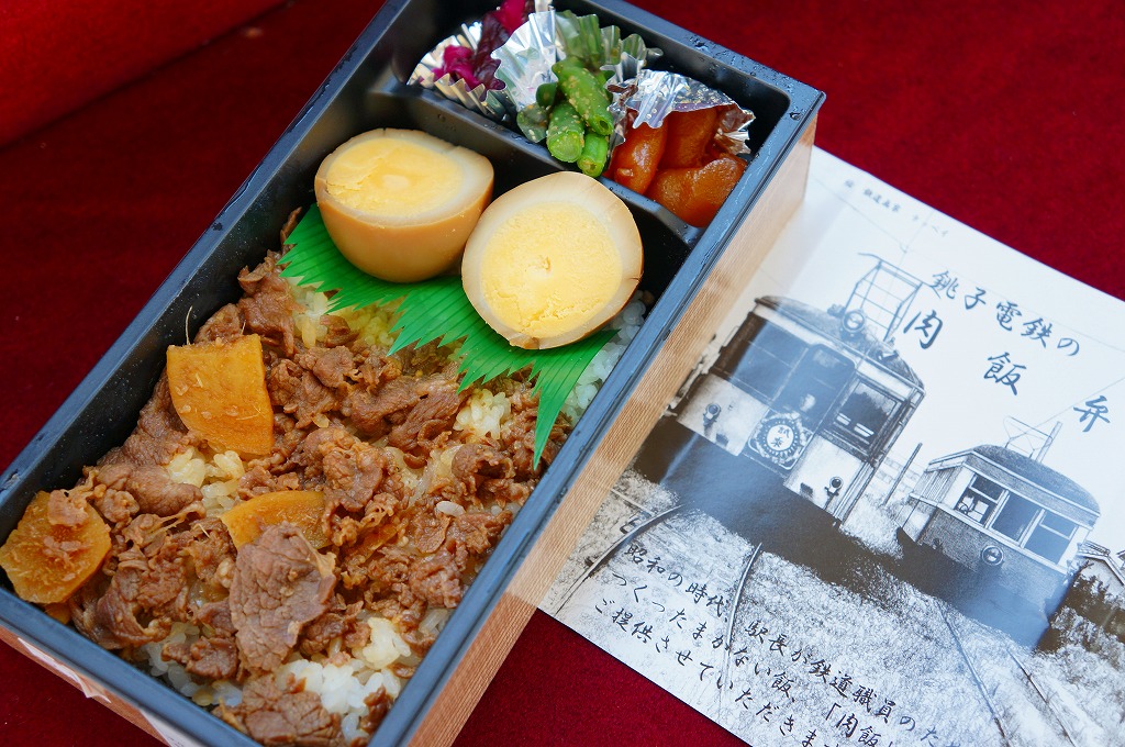 各地の駅弁でもおなじみの長方形のプラ製容器に、白御飯を詰め、甘めの牛肉煮をぶちまけて、半身の煮玉子をふたつ置き、インゲンや柴漬けなどの付合せを添える。出自からしてグルメではない、ジャンクフードかB級グルメのたぐいであるが、その線ではよくできた味。車内での駅弁がいらないローカル線で、そして駅弁屋が定着しなかった銚子で、こうして販売が継続されているのも、観光客向けをコンセプトになんでもまるごと詰め込んで浮ついた味ではなく、地に足を付けたことが功を奏しているのではないかと思う。