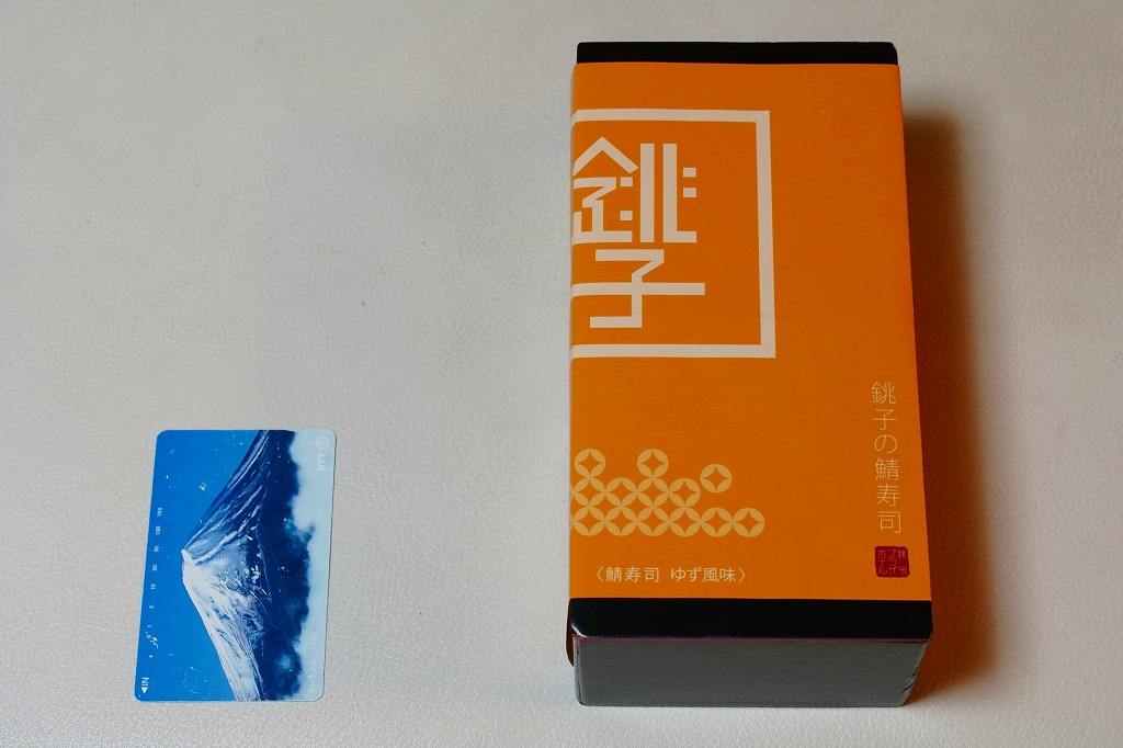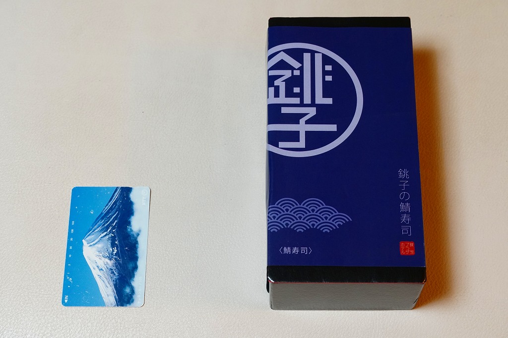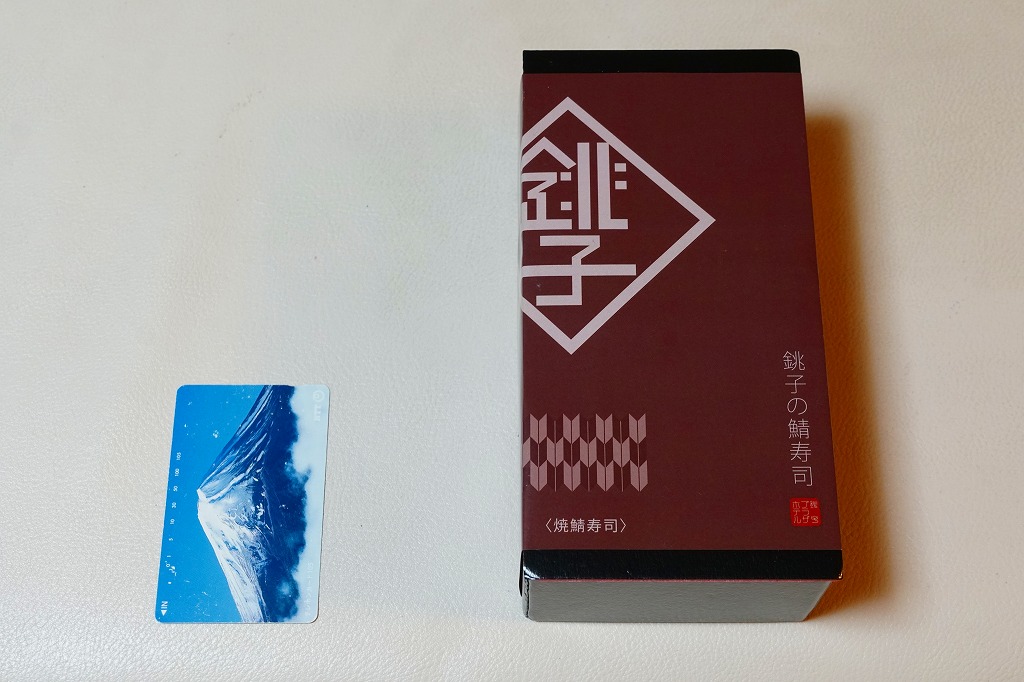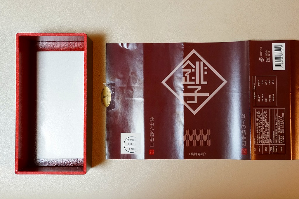 上記の商品「銚子の鯖寿司」の、焼きサバ寿司バージョン。青い包装紙が焼き色ないし醤油色になり、酢飯に丸々とした焼きサバを合わせる。ほどほどの脂の乗りと柔らかさが印象的。価格は2019年時点で1,080円、2023年時点で1,200円、10月までに1,500円、2025年時点で1,900円。
