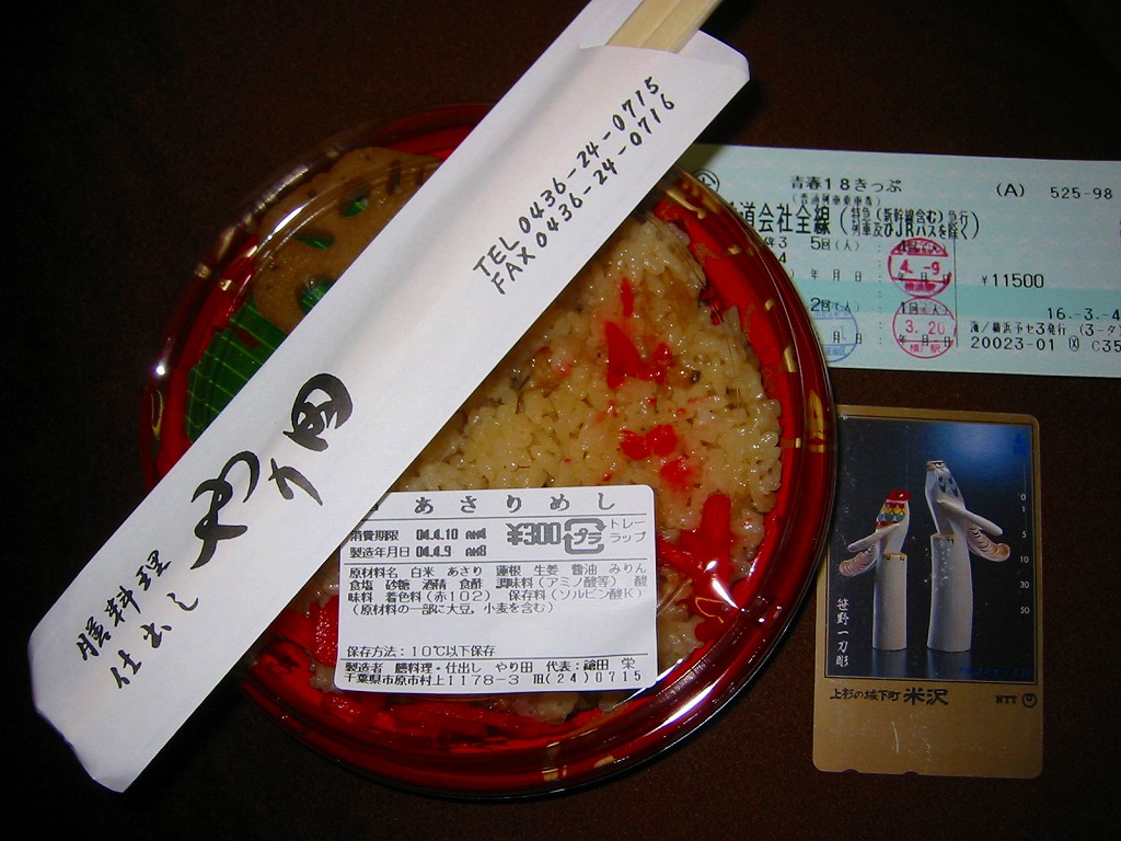 上記の駅弁「あさりめし」の、2004(平成16)年時点での姿。容器は異なるが、中身は同じ。18年の差があるのに、値段も変わらない。当時は鉄道会社の公式サイトに駅弁としての商品紹介があった。五井駅のJR駅と小湊鉄道駅を結ぶ跨線橋が、まるでスーパーの惣菜売場のようになっており、そこに数種類の弁当が置かれ販売されていた。