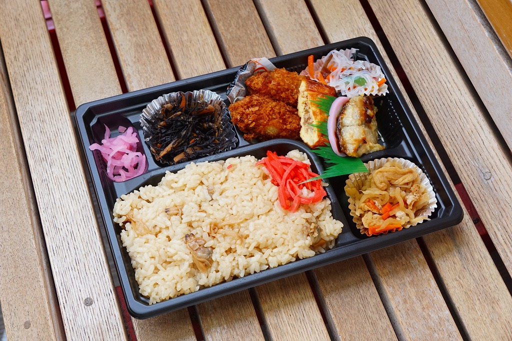 五井駅の駅弁。五井駅の小湊鐵道橋上通路で販売されている惣菜のひとつ。中身は紅生姜を添えたアサリの混ぜ御飯にひじきと、日替わりと考えられるおかずの数々。今回の購入時は焼サバ、カキフライ、オムレツ、切り干し大根、酢の物などが入っていた。これでたったの500円。小湊鐵道がかつて公式サイトで紹介した、独特な形態の駅弁である。調製元の閉店により、2025年10月30日限りで終売となった。