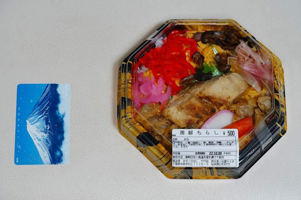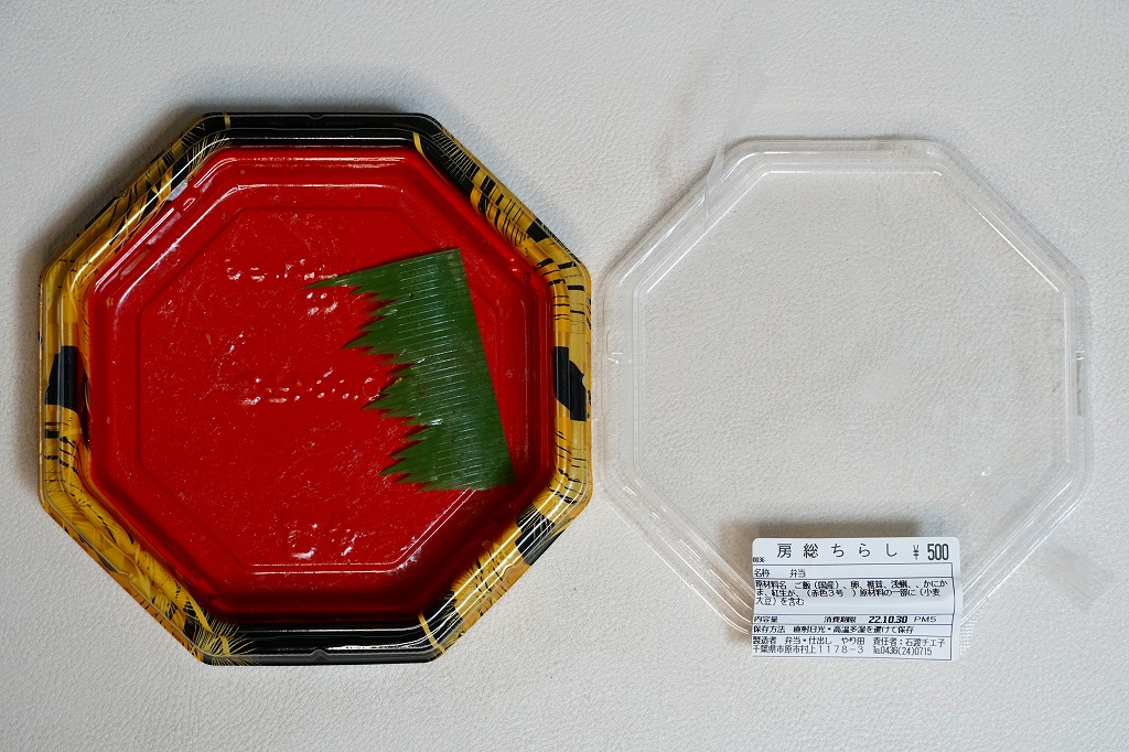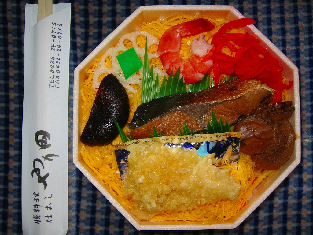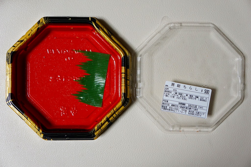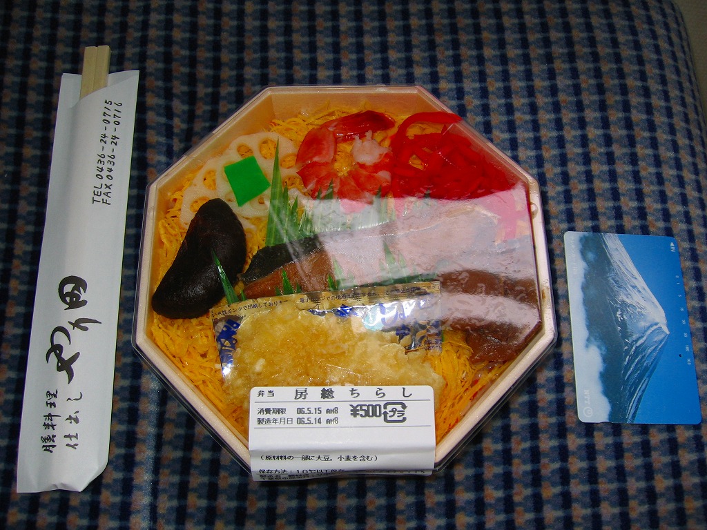 上記の駅弁「房総ちらし」の、2006(平成18)年時点での姿。正八角形の容器に詰めた白飯を錦糸卵で覆い、いくつかの具を散らした惣菜であることに違いないが、当時はもう少し駅弁らしい姿を持っていたようにみえる。具はエビ、椎茸、いかフライ、ホタテ、ブリ照焼、紅生姜、酢レンコン、パック醤油。うまい御飯と手作り感たっぷりの錦糸卵だけで食が進む感じがした。