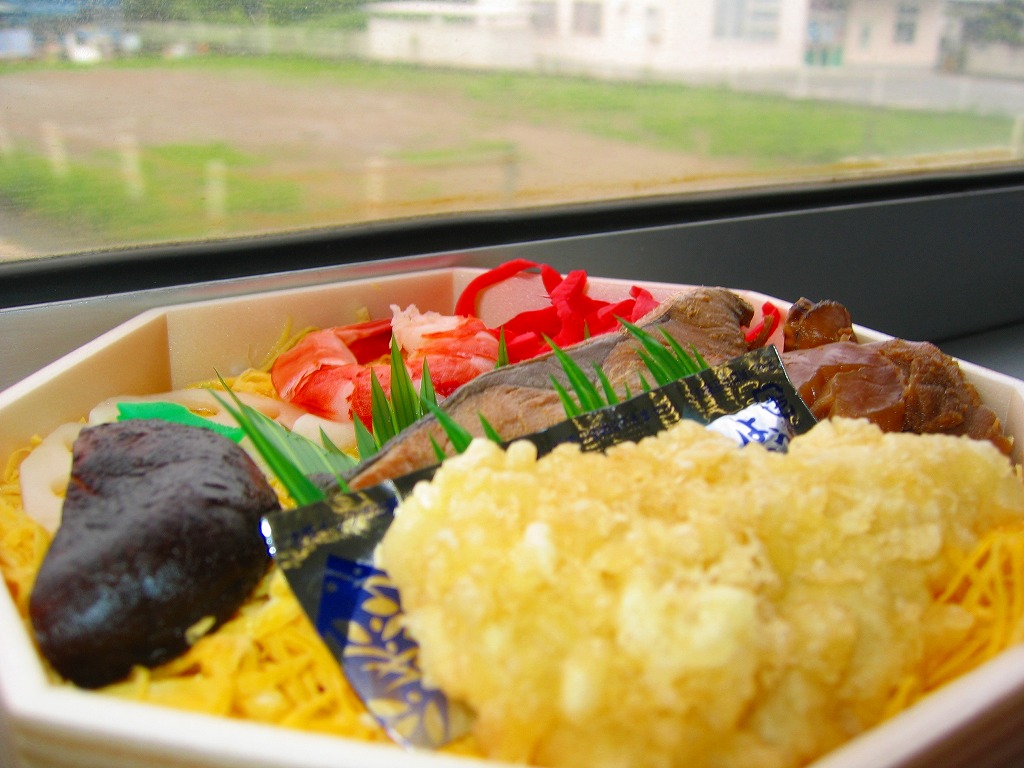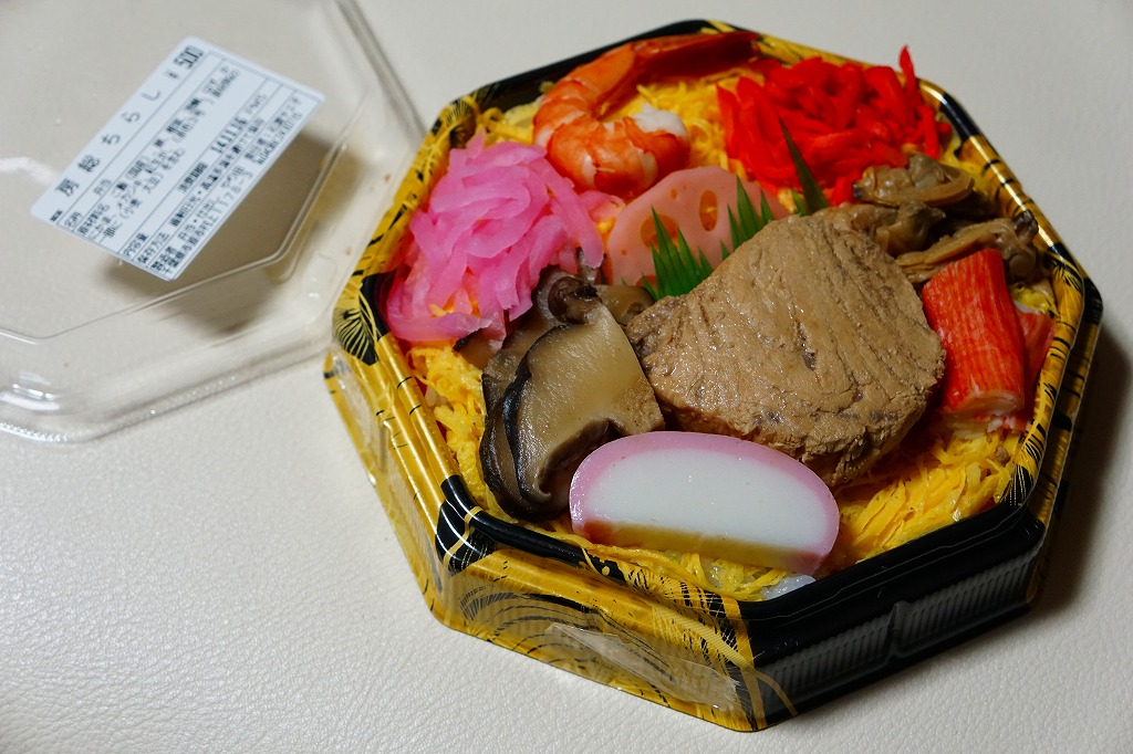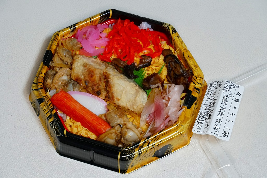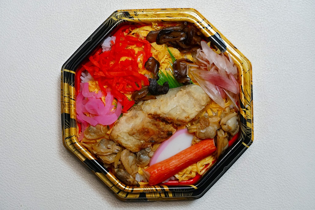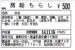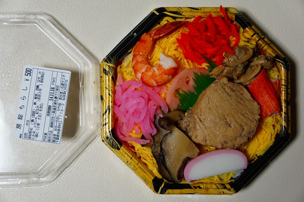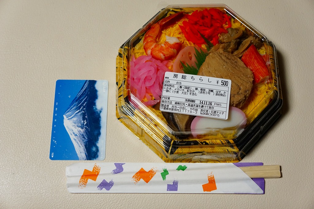 上記の駅弁「房総ちらし」の、2006(平成18)年時点での姿。正八角形の容器に詰めた白飯を錦糸卵で覆い、いくつかの具を散らした惣菜であることに違いないが、当時はもう少し駅弁らしい姿を持っていたようにみえる。具はエビ、椎茸、いかフライ、ホタテ、ブリ照焼、紅生姜、酢レンコン、パック醤油。うまい御飯と手作り感たっぷりの錦糸卵だけで食が進む感じがした。