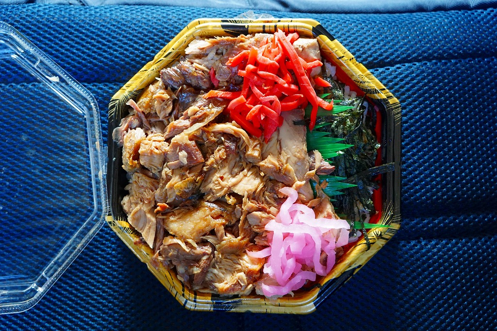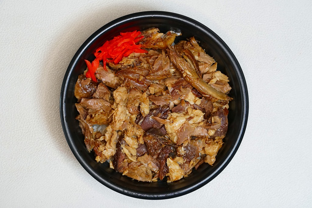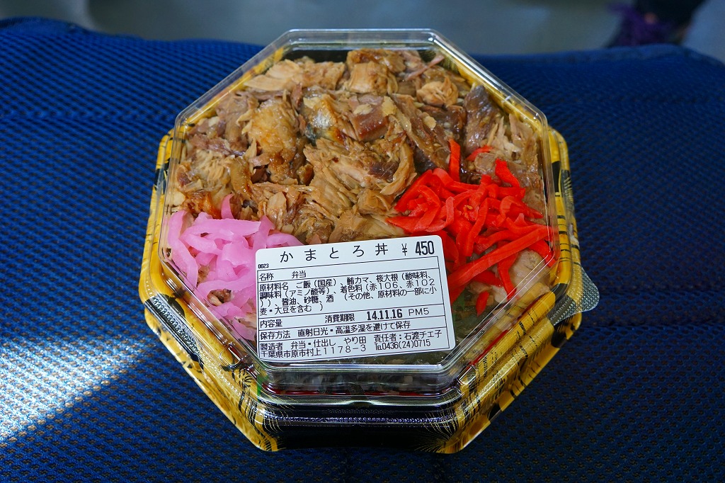 五井駅で小湊鐵道が駅弁と紹介した惣菜のひとつ。円形の容器に白飯を詰め、マグロのカマで覆い、紅生姜を添える。姿は駅弁というよりは惣菜で、うまそうな見栄え。駅弁ではまずお目にかかれない部位は脂が乗り、味ではどんな魚駅弁にも負けない、デリシャスなお魚丼。調製元の閉店により、2025年10月30日限りで終売となった。