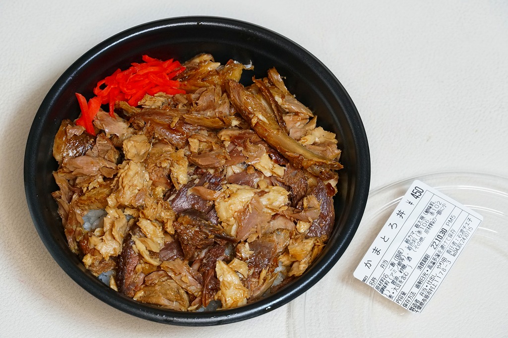 上記の駅弁「かまとろ丼」の、2014(平成26)年時点での姿。容器はおそらく決まっていないのではと思う。白飯をマグロのカマで覆い、紅生姜と刻み海苔と桜大根を添えていた。うまい味は変わらなくても、見栄えでは2022年のものが良い感じ。