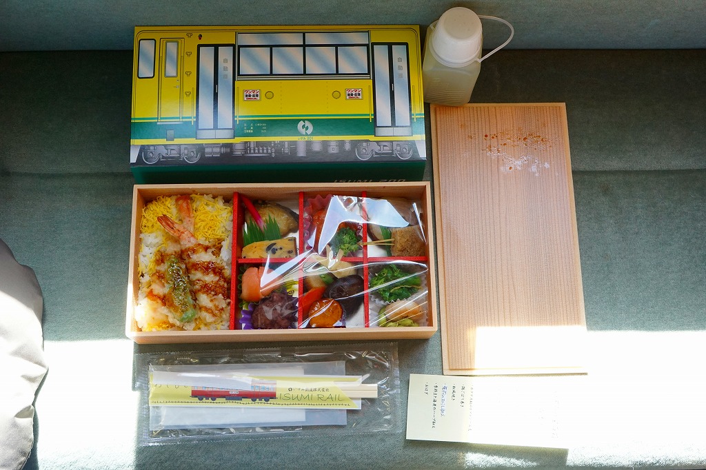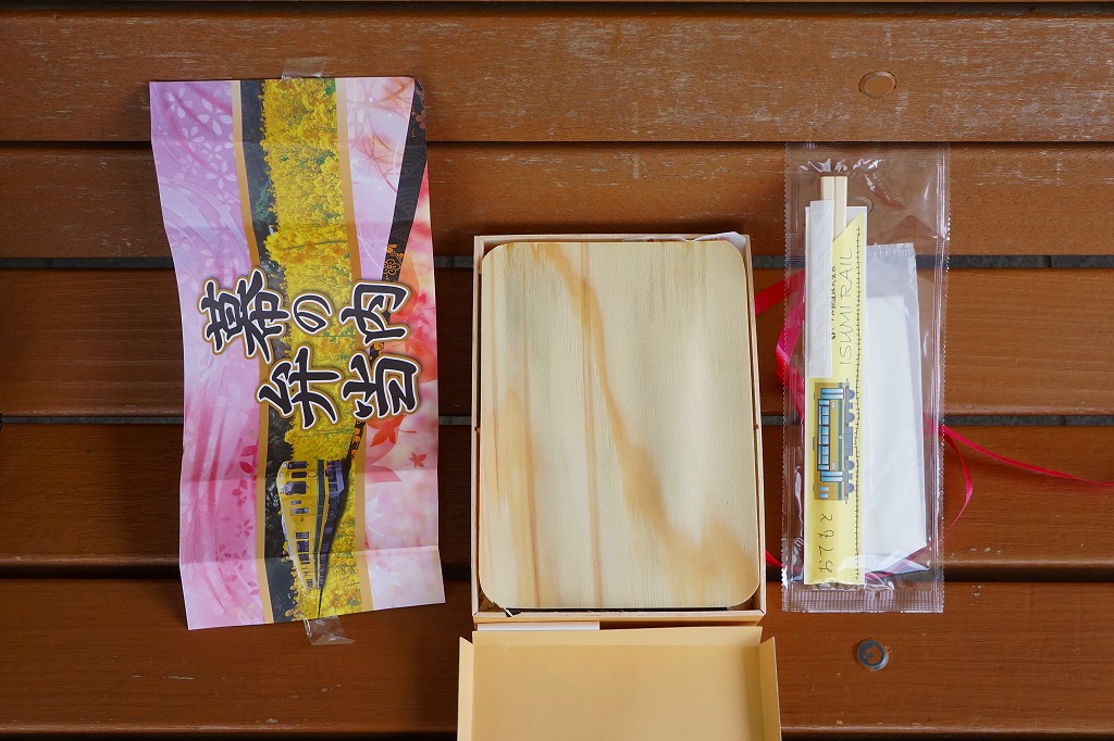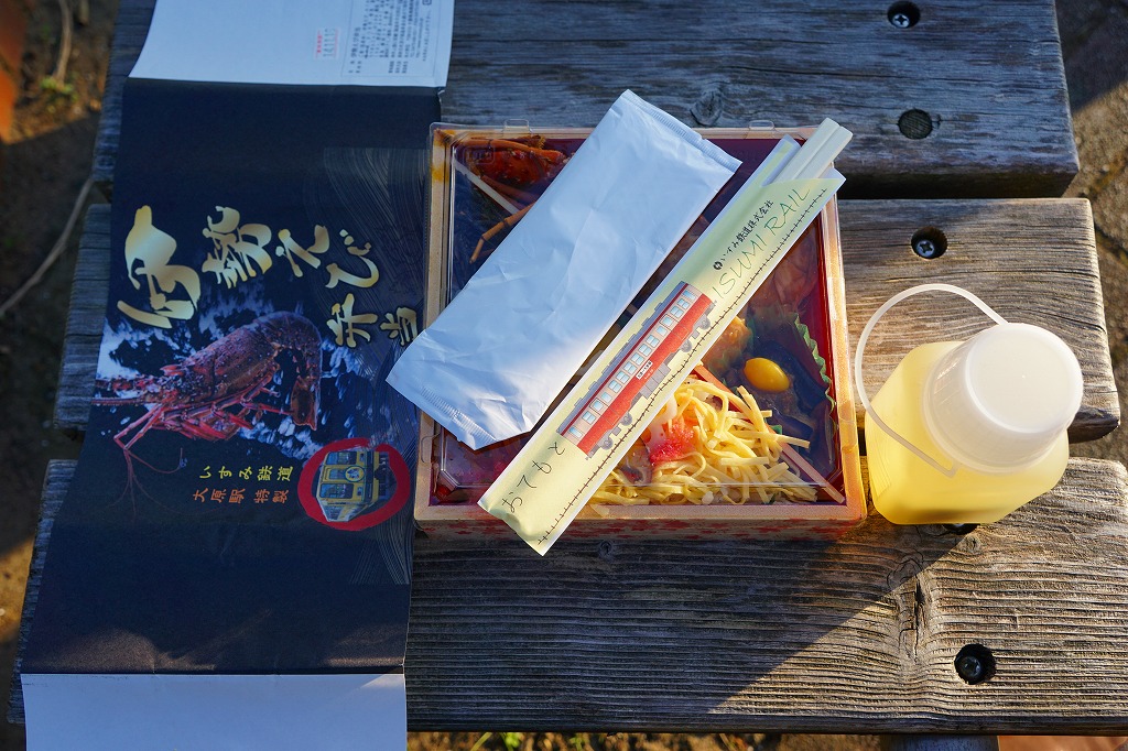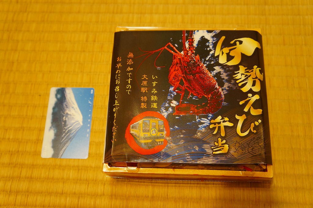 2011(平成23)年9月3日に発売。2010年3月の国吉駅「里山弁当」、2011年4月の大原駅「忠勝弁当」に次ぐ、いすみ鉄道で3番目の駅弁。調製元はイセエビとアワビが専門という御宿の旅館。原則は2日前まで2個以上の電話予約での土休日の販売であるが、この日はたまたま売店に置かれていた。