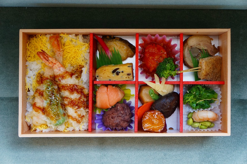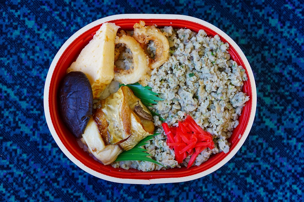 中身はカニとエビとししとうの天丼、ひじき入り玉子焼、銀ダラ西京味噌焼、ホタテ貝柱のトマトソース煮、なす田楽、鶏ごぼう巻き、ジャガイモ餅、野菜の煮物、大学芋、おはぎなど。鉄道会社公式サイトの宣伝文のとおり、確かにどれも主役になれるようなおかずの数々に満足。