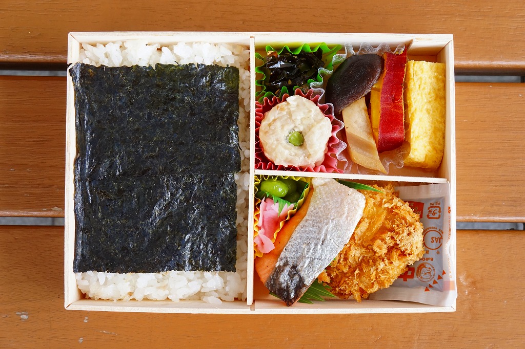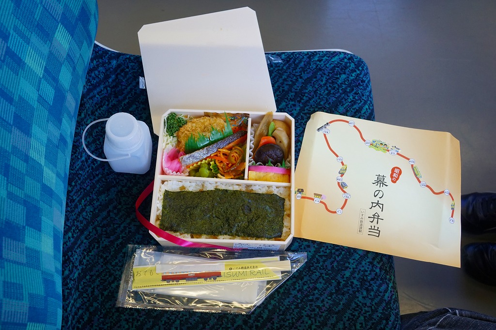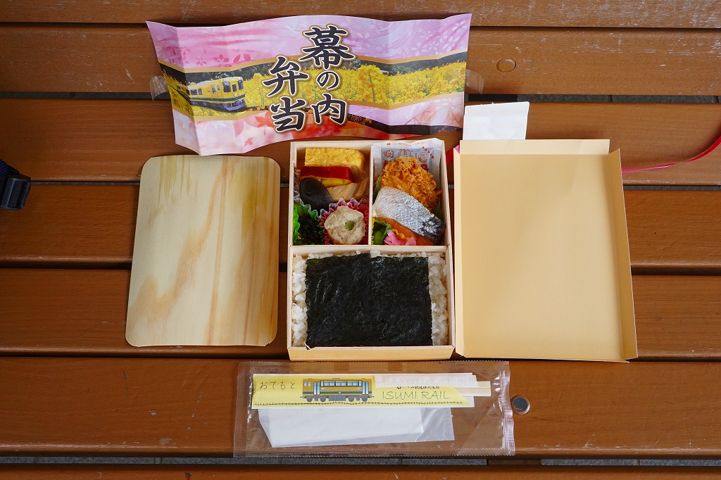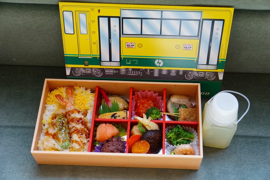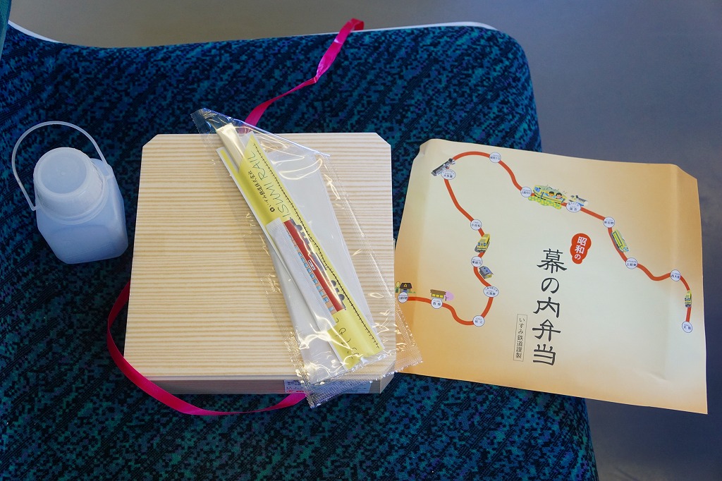 掛紙には、駅弁の名前と、いすみ鉄道の路線図を、シンプルに描く。中身は日の丸俵飯に、焼き魚(サケ)、かまぼこ、玉子焼の幕の内駅弁三種の神器、シイタケやレンコンなどの煮物、コロッケ、焼売、煮豆、大根桜漬など。たしかにこれは、昭和時代の国鉄駅の幕の内弁当。とてもきれいにつくられている。写真にないが、これもやはり昭和時代の国鉄駅で駅弁とともに売られていた、ポリ茶瓶がひとつついてきた。土休日のみの販売、予約を推奨。予約先は調製元でなく、いすみ鉄道(0470(82)2161)となる。2017(平成29)年7月に、上記の「幕の内弁当」へリニューアル。