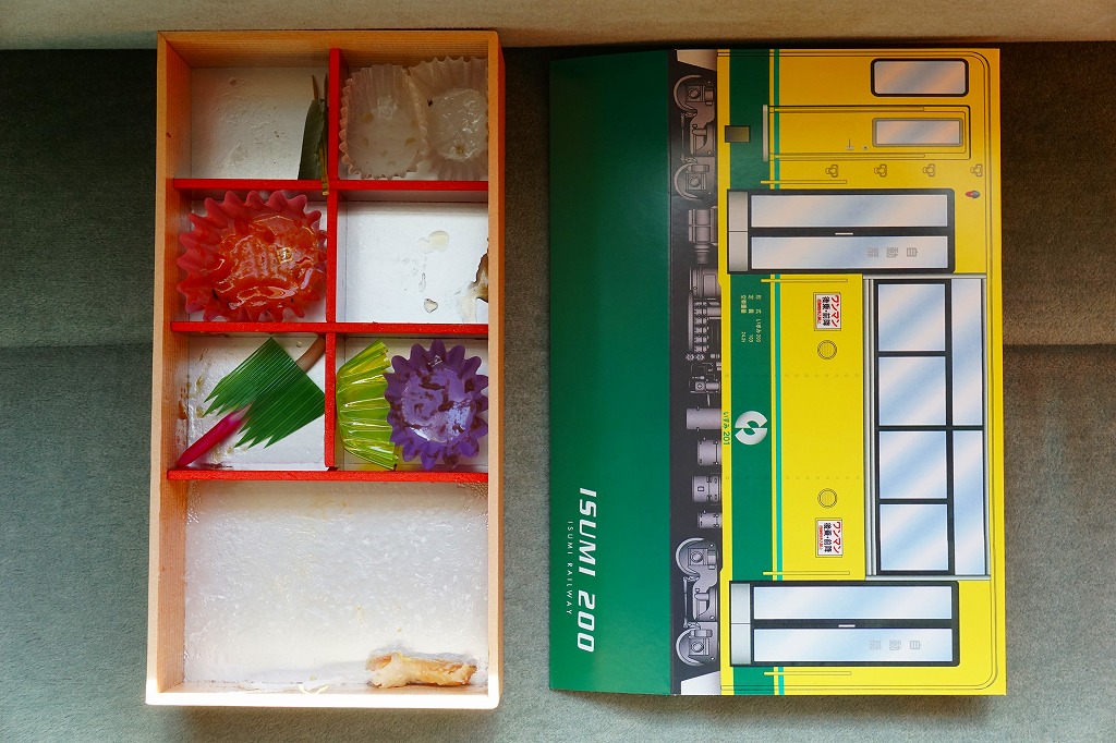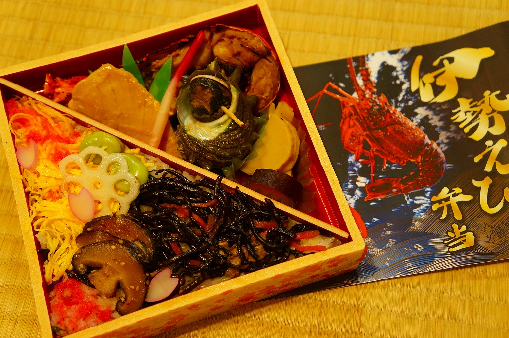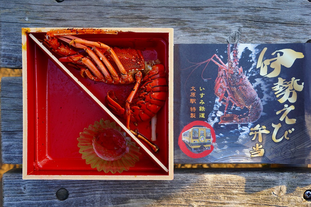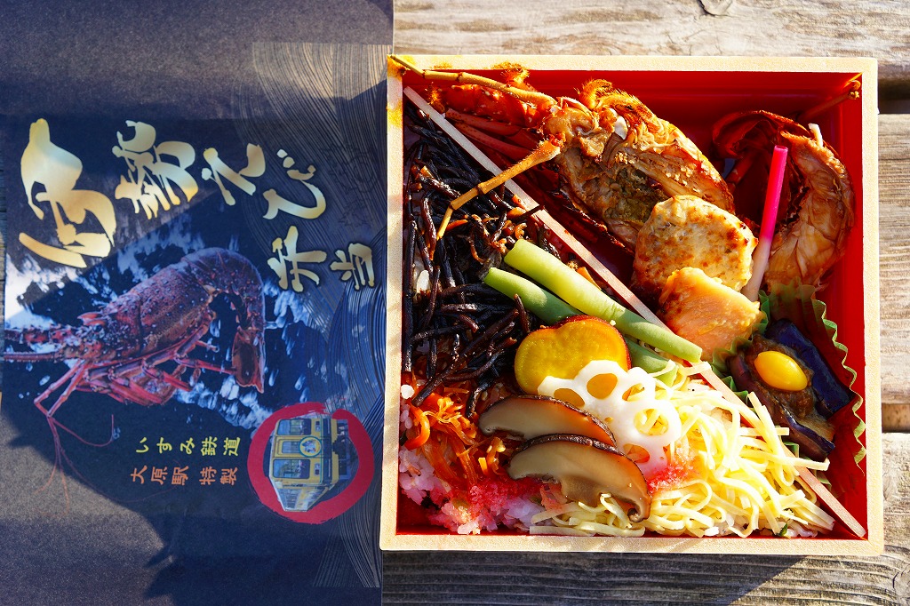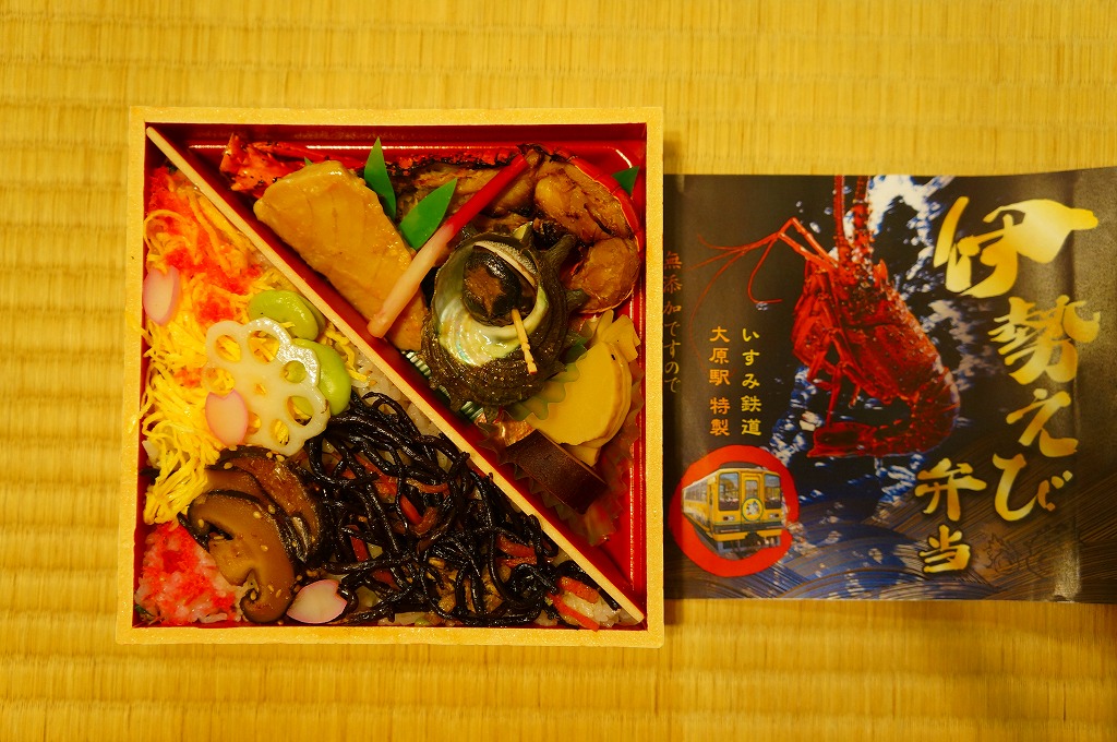 柔らかな正方形の容器を、跳ねるイセエビにいすみ鉄道の車両を添えた絵柄の黒い掛紙を巻く。中身は半分が御飯でヒジキやソラマメや錦糸卵などを使うちらしずし、半分がおかずでカジキ西京焼、サザエ壷焼、半身のイセエビの調製元自慢の鬼殻焼。外房の食材で固めている。