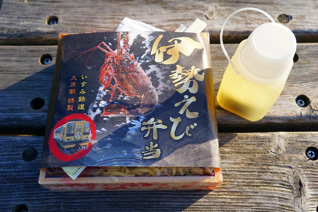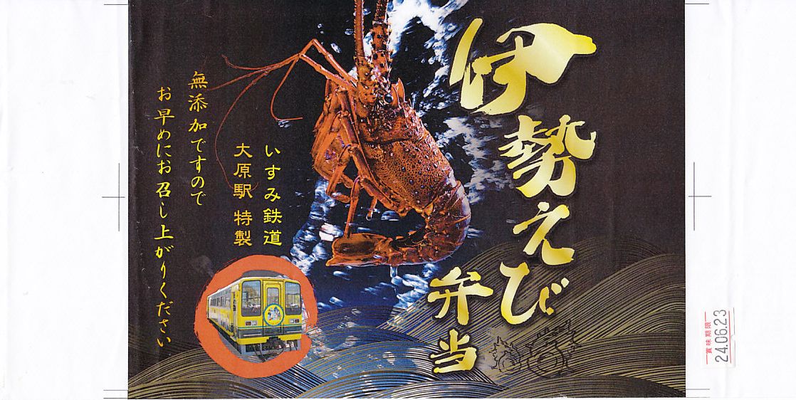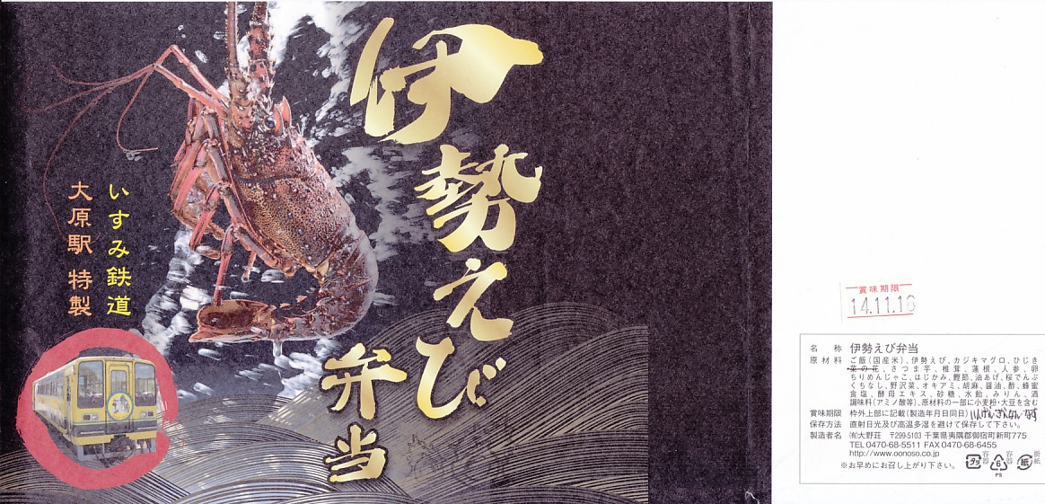 下記の大原駅弁「伊勢えび弁当」の、2014(平成26)年時点での姿。中身はだいたい同じだが、サザエがなくなり、カジキマグロが入り、半身のイセエビが大きくなっていた。掛紙の表記も、少しだけ変わっている。大原駅で駅弁を買うと、ポリ茶瓶(ポリ容器のお茶)をひとつもらえた。2019年までの販売か。
