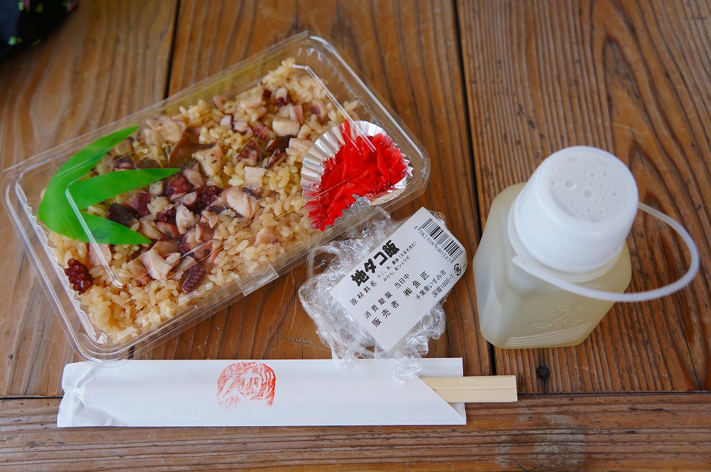 2011(平成23)年までに発売か。屋台向けなヘナヘナの透明プラ製容器にタコの炊込飯を詰めて紅生姜を添える。見た目はただの惣菜だが、食べてみれば身の締まるタコのそぼろが茶飯にぎっしり混ざる、良質なB級グルメ。駅弁の容器を与えて添え物をして500円という姿を見たいと思った。調製元は大原港の干物屋さん。なお、写真のポリ茶瓶(ポリ容器入りのお茶)は別売り。