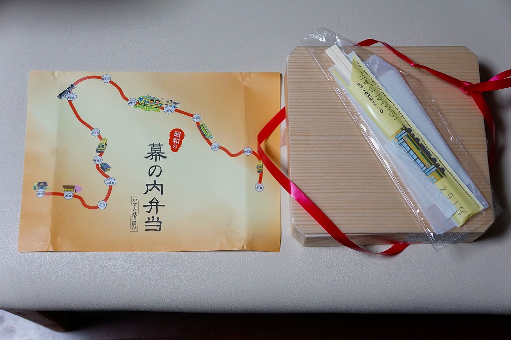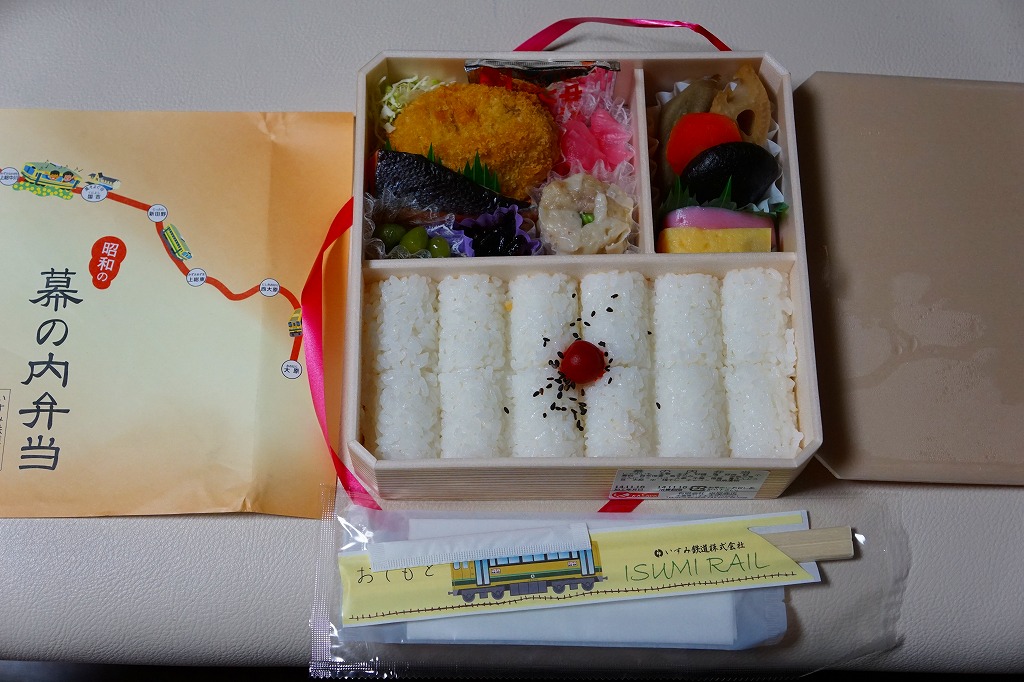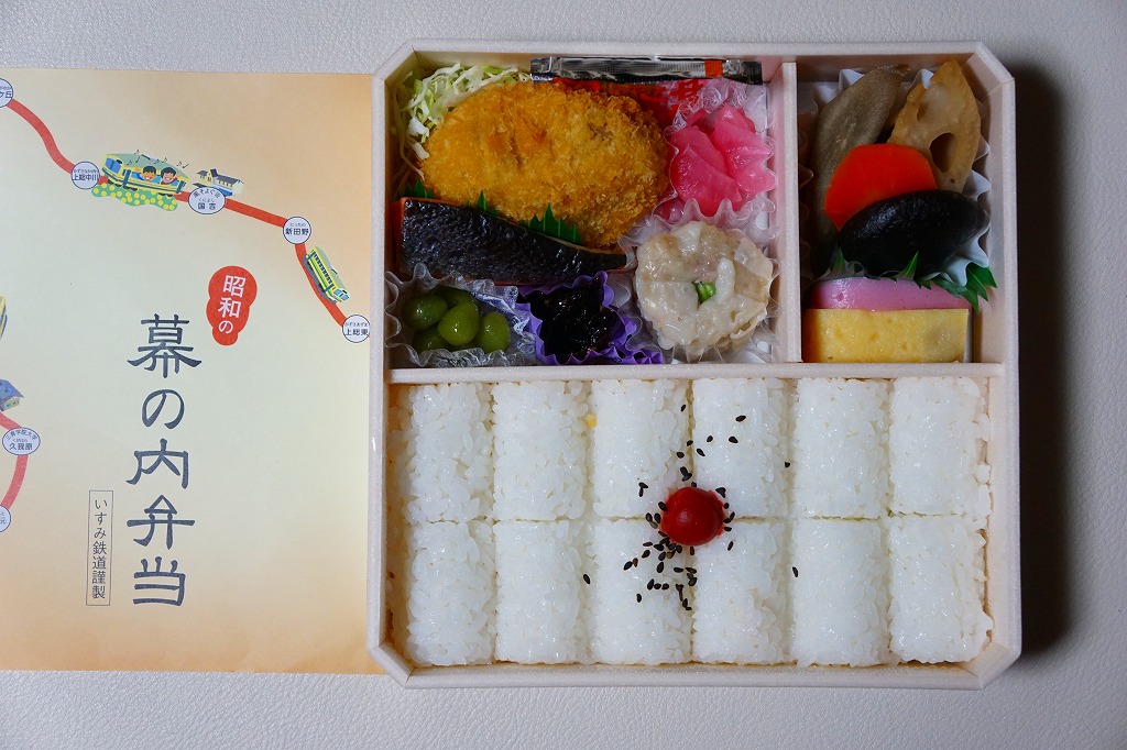 2014(平成26)年7月5日の発売。同駅のタコ飯弁当が6月から9月まで販売できないことと、大原駅の駅弁は国鉄時代の駅弁の定義でいう特殊弁当しかないことで、いすみ鉄道が駅弁屋に昭和の幕の内弁当の制作を依頼したという。そのモデルは、肥薩線吉松駅の幕の内駅弁だという。