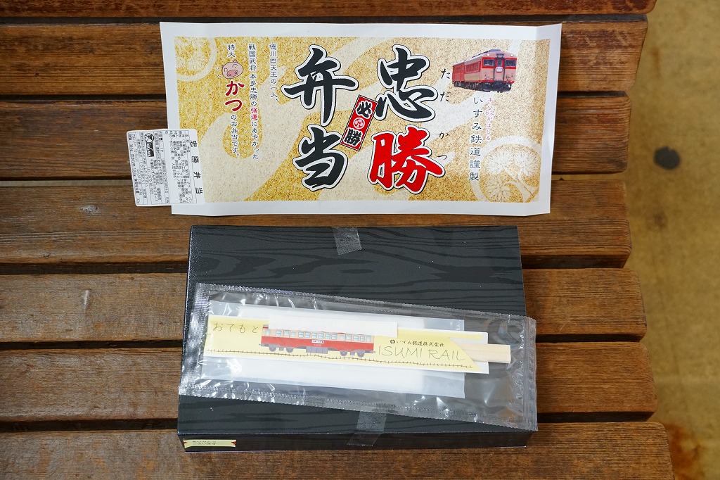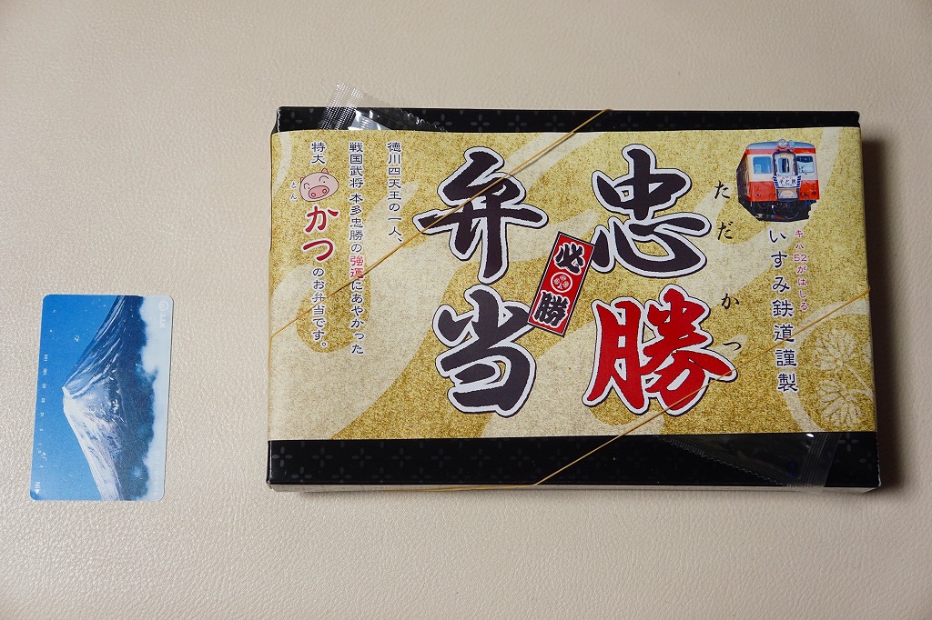 2011(平成23)年4月に発売か。「里山弁当」に続く、いすみ鉄道の駅弁の第2弾。駅弁の名前は戦国武将で大多喜藩10万石の初代藩主である本多忠勝にちなみ、駅弁の中身はその名にちなんだトンカツ弁当。中身は日の丸御飯とトンカツ1枚とキャベツ千切りに、タコ、花豆、たくあん、プチトマト、パセリを添えたもの。つまりシンプルなトンカツ弁当。大きく適度に柔らかく、衣がサクサクの良いトンカツが印象的。単に食べるだけでも、おいしいお弁当。