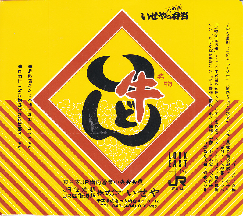 1990年代のものと思われる、昔の佐倉駅弁のパッケージ。やきとり弁当のものと同じ大きさと構造を持ち、右側の解説文「牛どん弁当・由来のお話し」も同じように書いてある。佐倉駅に加えて、四街道駅でも売られていたことが分かる。
