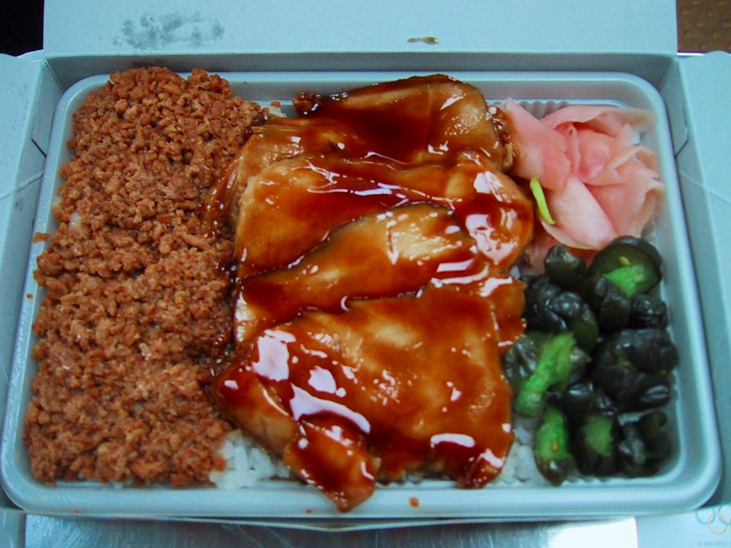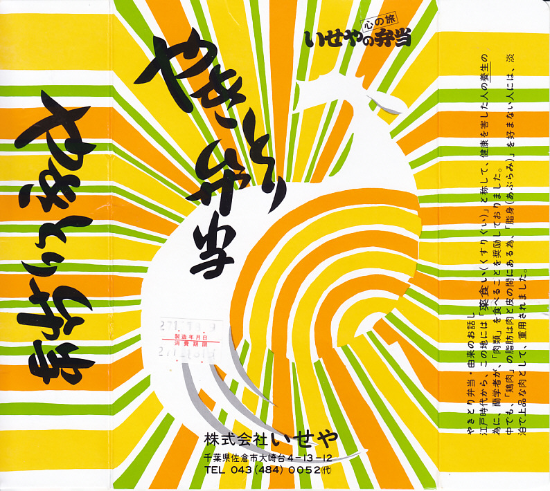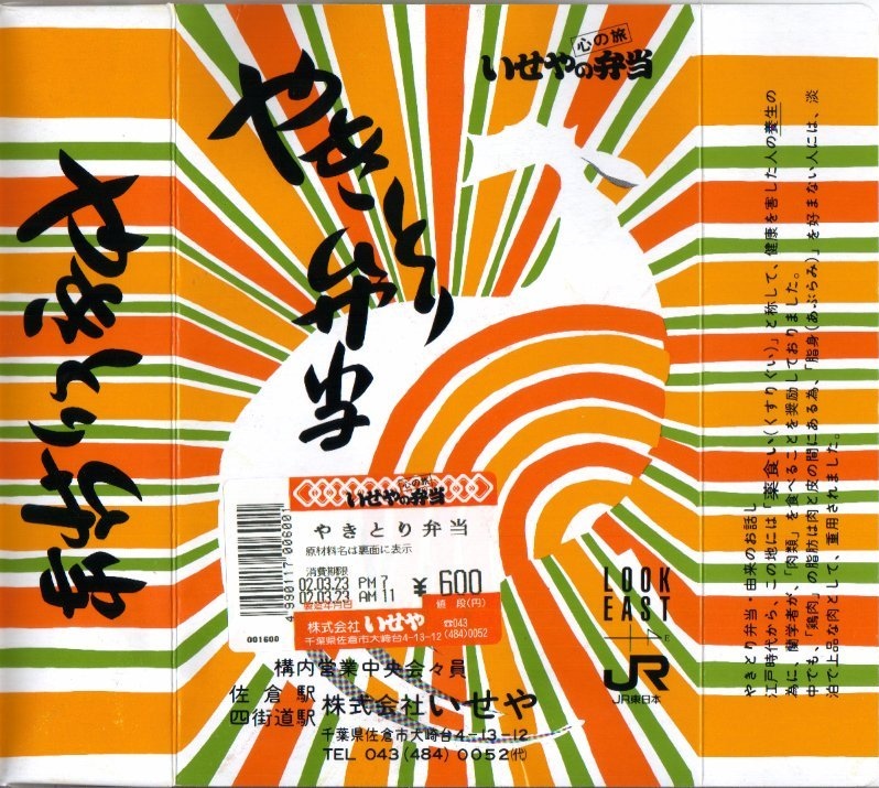 1961(昭和36)年に発売された、かつての佐倉駅弁の代表格。ボール紙のパッケージに白いトレーを入れ、その容器いっぱいに白御飯を敷き詰め、甘めのタレにからめた脂身のない地鶏胸肉の焼き鳥と鶏そぼろを載せた駅弁。21世紀になってJR東日本の発足当初の観光キャンペーン「LOOK EAST」のロゴマークを見るとは思わなかった。2002年3月31日限りで駅弁業者の撤退により、駅弁としては終売となったが、佐倉でのイベントで販売されたり、仕出し弁当として調製元へ注文することができた。2017年1月の同社の破産により、今は買えない模様。