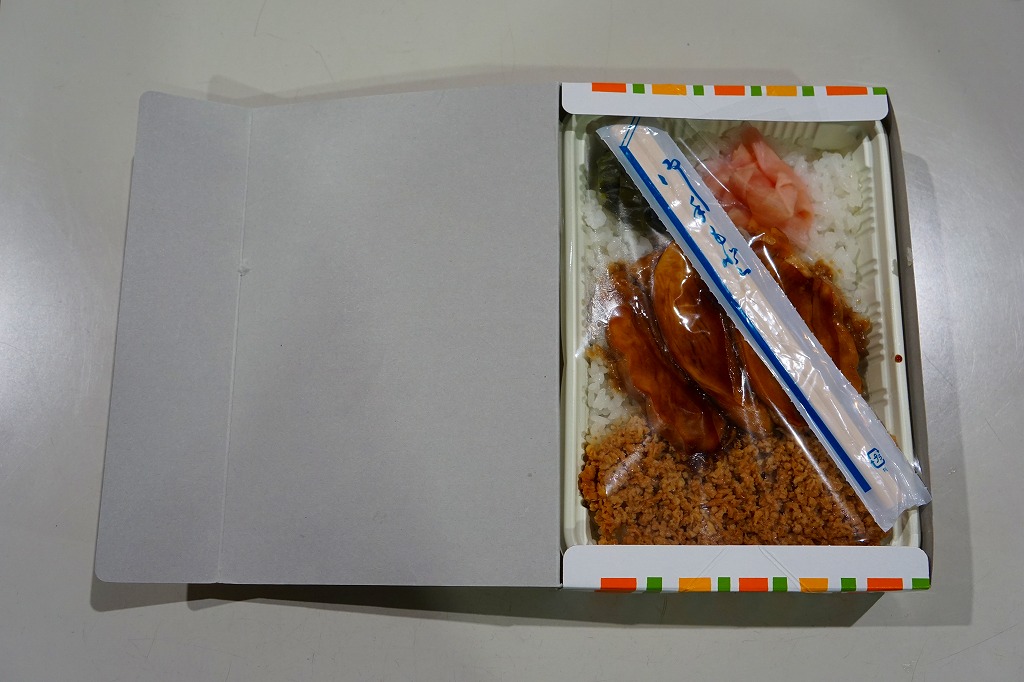 2002(平成14)年3月限りで駅から消えた、かつての佐倉駅弁が、2015(平成27)年時点で地元の弁当として生き残っていた。写真のとおり、容器も中身も駅弁当時のまま。さすがにパッケージからは、鉄道に関連する表記が消えている。甘味のある鶏肉のタレや、辛味のある鶏そぼろの味付けは、今の外食や中食にない、懐かしさを覚える味。地元のイベントで販売されたり、こうやって団体予約により買うことができた。2017年1月の調製元の破産により、今は買えない模様。
