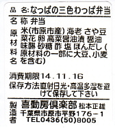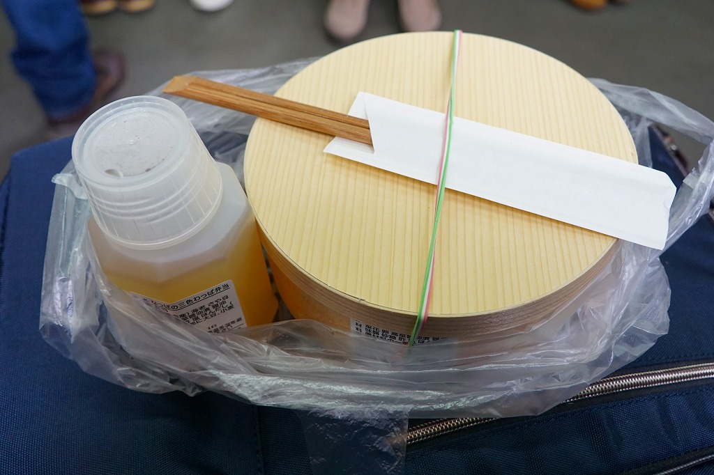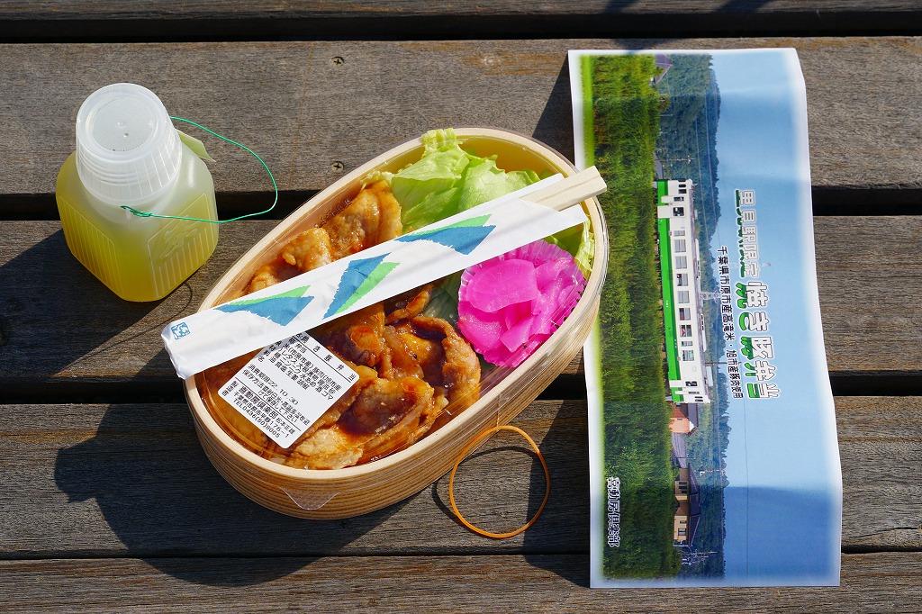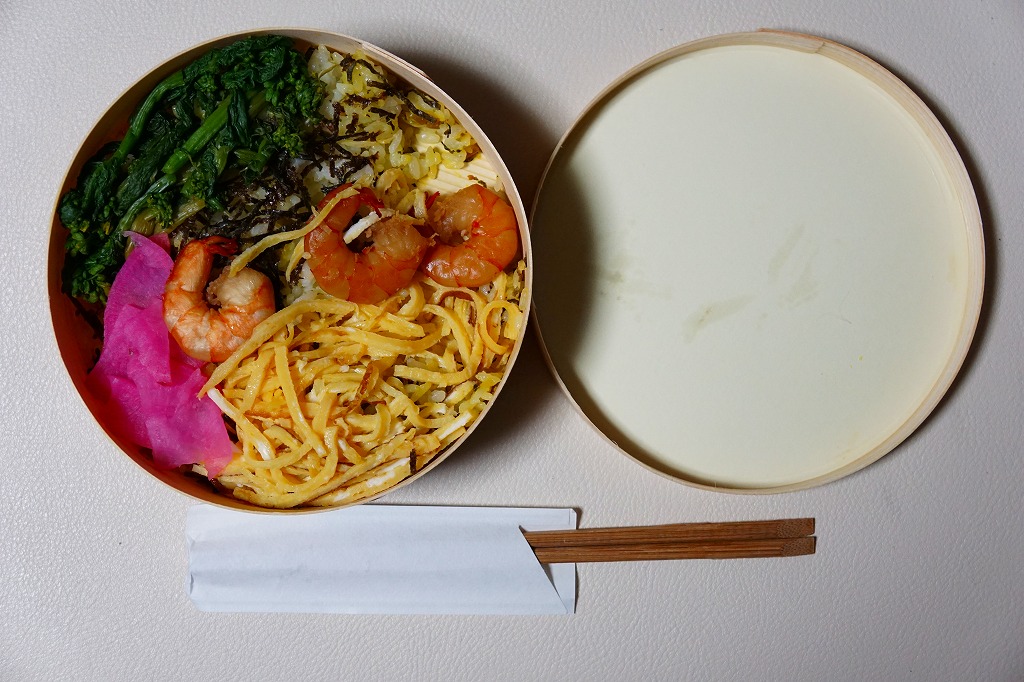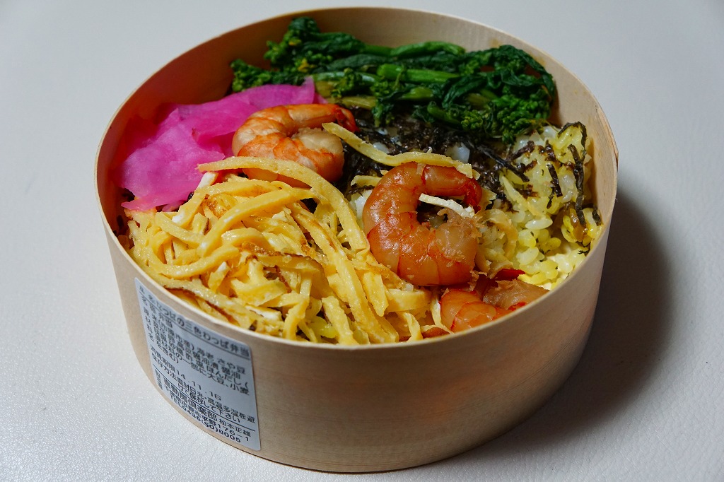 「わっぱ」ということで円形の容器に、高菜混じりの酢飯を詰め、なっぱ(菜の花)と海老と錦糸卵と刻み海苔で覆い、桜大根を添える。添付のポリ茶瓶には、梅干しと生姜のスープが入っていた。芸術作品なのに堅苦しさのない、手作り感と暖かみのあるお弁当。食べていて、おかずに困る感じは受けない。この弁当は2014年内まで、土休日に里見駅で売られたらしい。