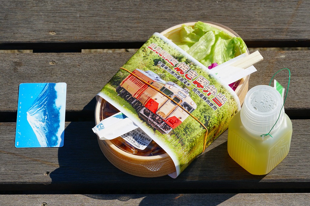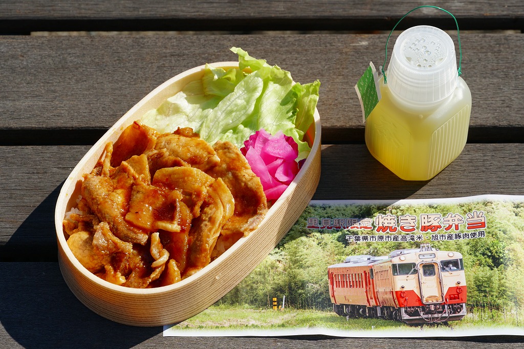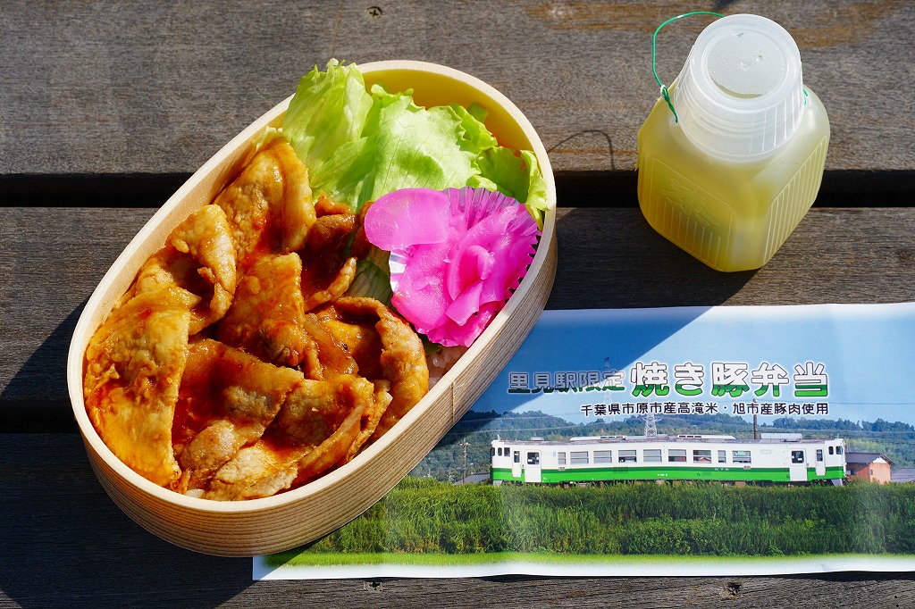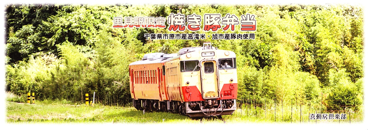 2021(令和3)年8月までに里見駅で発売か。不定の土休日に、里見駅のホーム上で、様々な飲食物等に混じって売られるお弁当。長円形の柔らかい容器に、小湊鐵道の列車の写真を使う掛紙2種類のいずれかを巻く。中身は千葉県市原市産高滝米の白飯を、旭市産の焼き豚で覆い、レタスと大根桜漬を添えるもの。甘辛な醤油だれで味わう、みずみずしい豚丼。ポリ容器のお茶とセットで販売。2023年時点で全て受注生産となり、購入には前日までにSNSかEメールでの、または当日に電話での予約が必要である模様。価格は2021年時点で1,000円、2025年時点で1,200円。