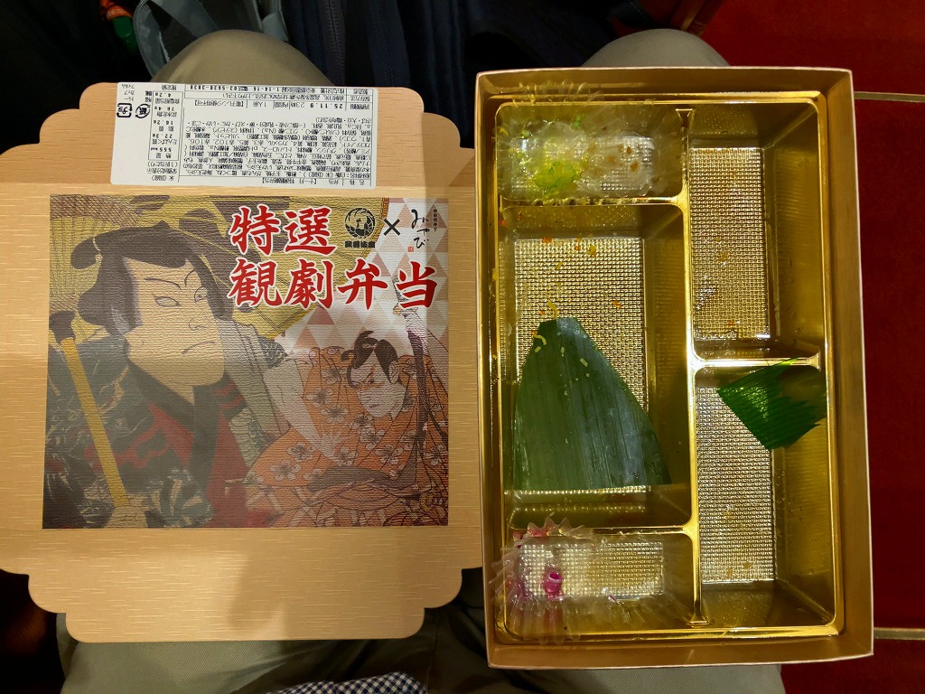 これは駅弁でなく、歌舞伎座で買えたお弁当。弁当の名前は食品表示で「十一月特製観劇弁当」とあり、おそらく歌舞伎座の演目と同じく月替わりで出しているのだろう。木目柄で大きめな紙容器に、歌舞伎の華やかな絵柄の掛紙を載せる。この容器に詰めた金色のプラ製トレーで、白飯に梅干しを据え、酢飯を錦糸卵で覆い、玉子焼きや海老やイカなどの焼き物や揚げ物、にんじんや高野豆腐やがんもどきなどの煮物、根菜や茎わかめなどの和え物、煮あさりと柴漬けを添える。東京駅の高級駅弁と同じような雰囲気。この調製元の弁当は以前から、東京駅の駅弁売店「膳まい」改め「HANAGATAYA」でも売られている。