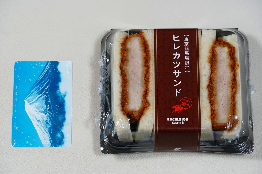 コーヒーチェーン「エクセルシオールカフェ」東京競馬場店限定のメニュー。ヒレカツのソース付けを食パンに挟んだカツサンドを3切れ、惣菜向けプラ容器に詰め、ラップで密封し、商品名を書いた茶色い紙帯を巻く。競走馬と「カツで勝つ!」の絵柄で、昭和時代の鉄火場のセンスが、令和の美しくきれいな競馬場内のカフェに残る。下記の約20年前とやっていることは同じで、値段はなんと据え置かれているが、包装も中身もだいぶ簡素になった。