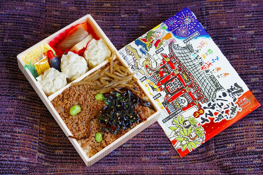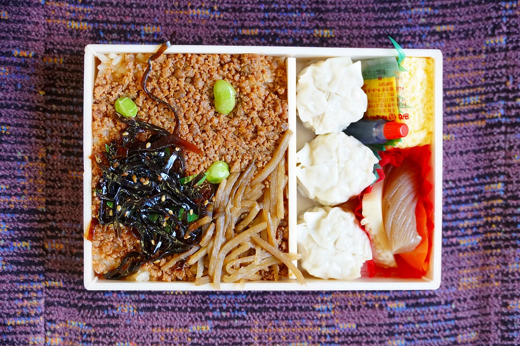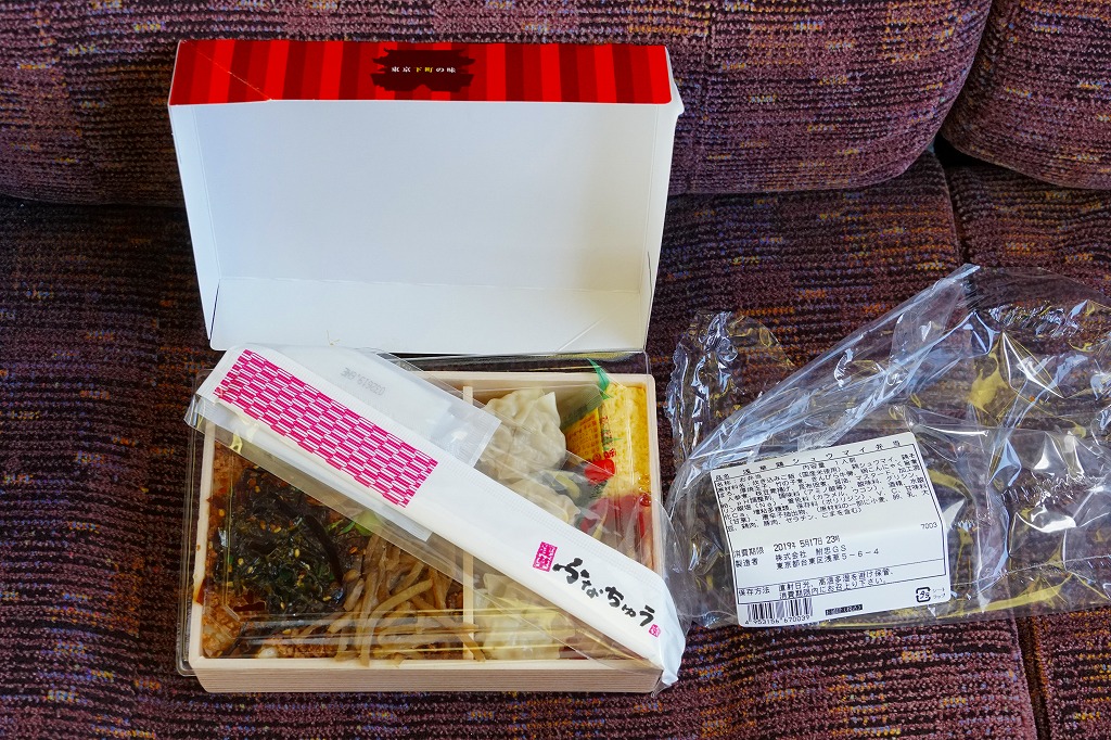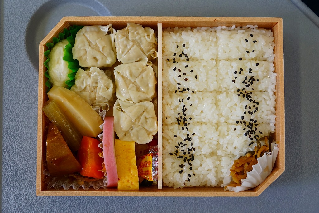 1954(昭和29)年発売の横浜駅弁「シウマイ弁当」によく似ていると思うが、どちらもつまりシウマイを入れた幕の内弁当であるから、不自然ではないと思う。その伝統の駅弁に比べると、こちらは飯も焼売もおかずも、水気があり柔らかくなっている。