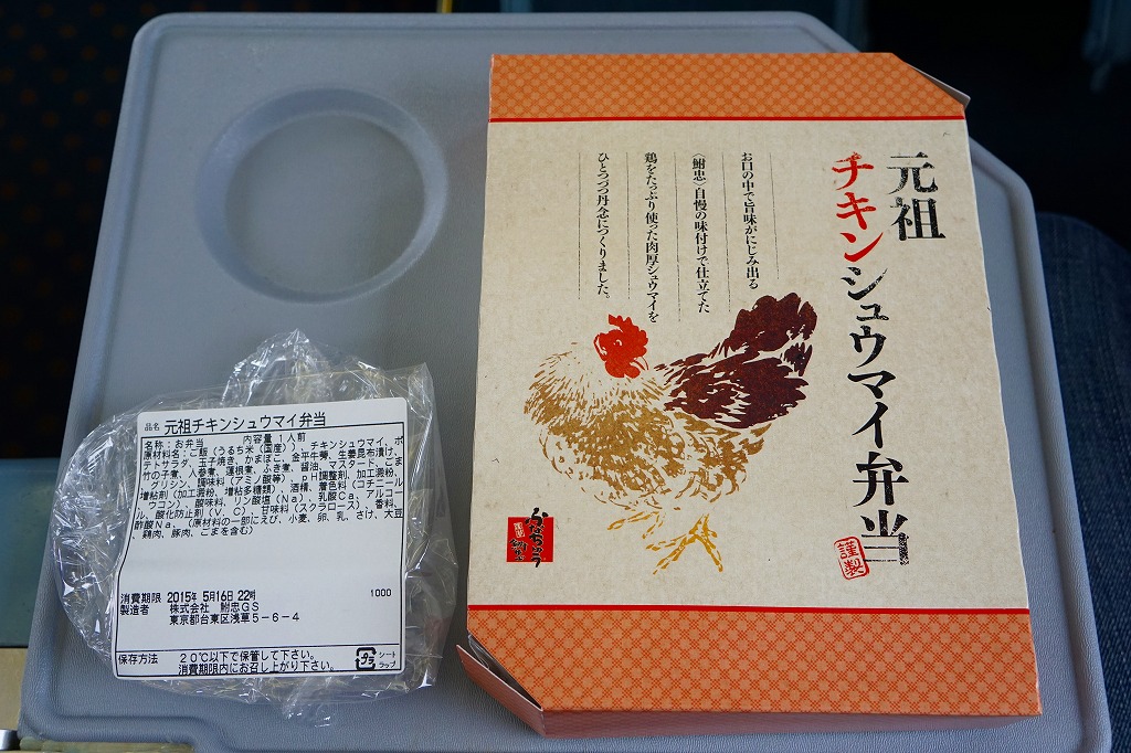 上記の駅弁「浅草鶏シュウマイ弁当」の、2015(平成27)年時点での姿。当時は駅弁として知られたり紹介されることは、ほとんどなかったのではないかと思う。見た目も中身も後のものとはだいぶ違い、ボール紙のふたにはスマートなデザインで宣伝文を書き、中身は俵飯、チキンシュウマイ5個、タケノコやニンジンなどの煮物、ポテトサラダ、かまぼこ、玉子焼、きんぴらごぼう、生姜昆布漬だった。