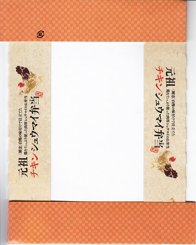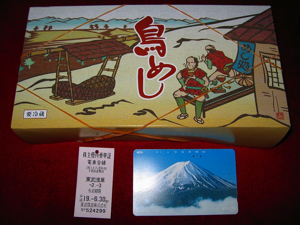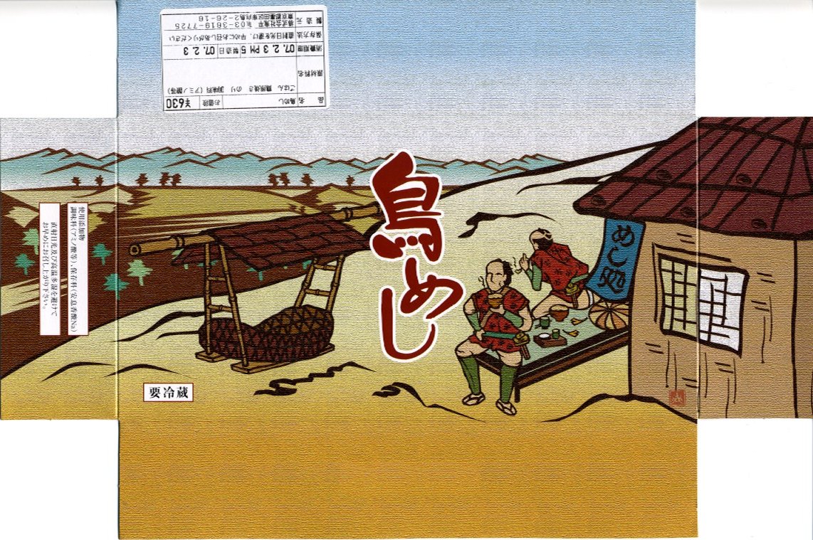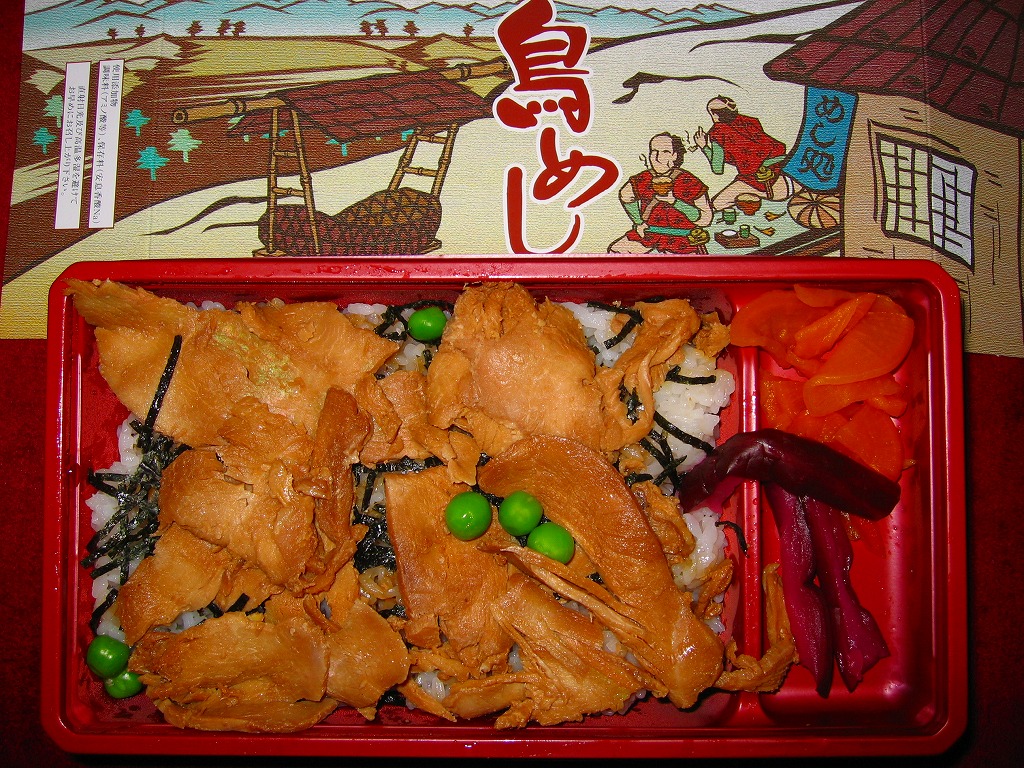 東武鉄道の浅草駅で、以前から販売されていた駅弁。トレーを接着した長方形の容器に、江戸時代の田舎を描いたと思うボール紙でふたをして、輪ゴムで留める。中身は御飯の上に刻み海苔を振り、鶏肉を載せてグリーンピースを散らし、タクアンと柴漬を添える。