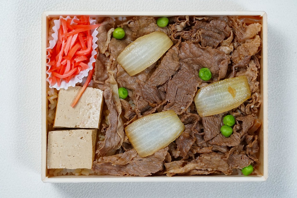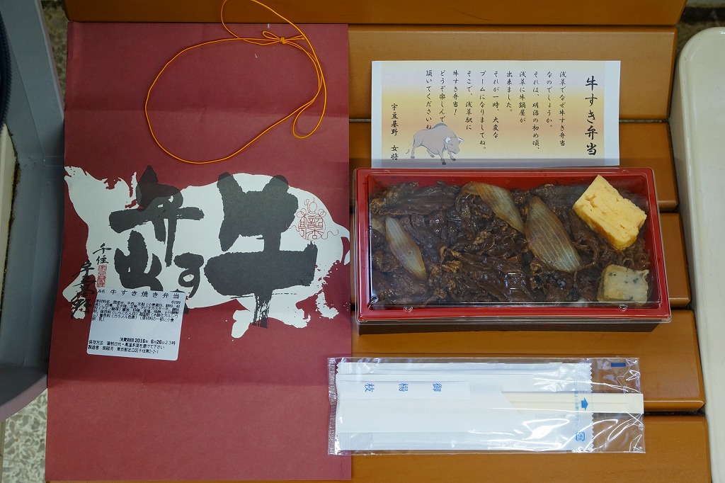 2012(平成24)年の発売か。掛紙や添付のチラシで「牛すき弁当」、食品表示ラベルで「牛すき焼き弁当」、売店の掲示で「浅草牛すき弁当」と名前が異なる。長方形の容器に白御飯を詰め、割り下で真っ黒になった牛肉煮で覆い、タマネギ、シラタキ、玉子焼、お麩を添えたり散らすもの。明治の初め頃に浅草で牛鍋屋が一時的なブームになったことにちなみ、この駅弁ができたという。常温で昼飯にモリモリ食べられる牛鍋丼。調製元の2017年頃の撤退により、今は売られていないはず。