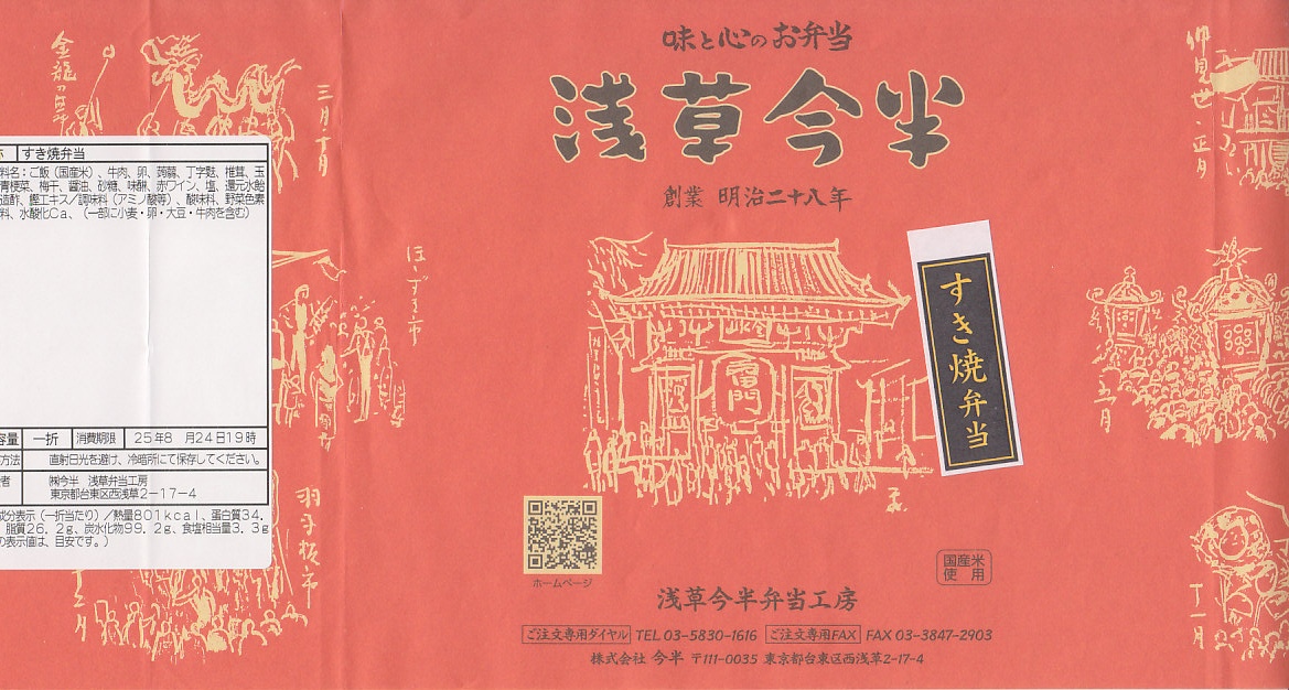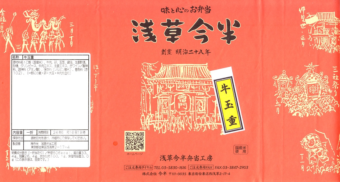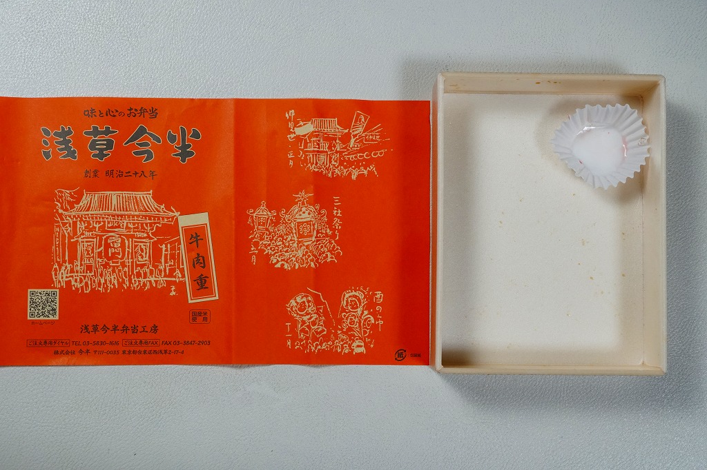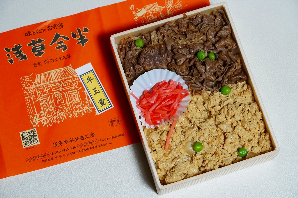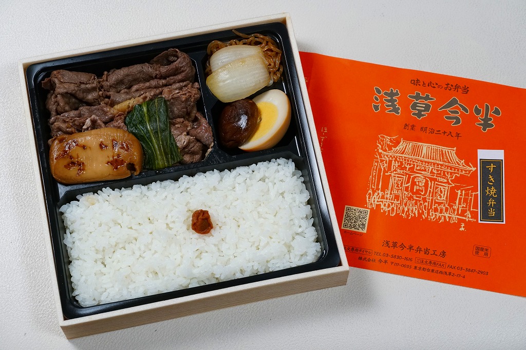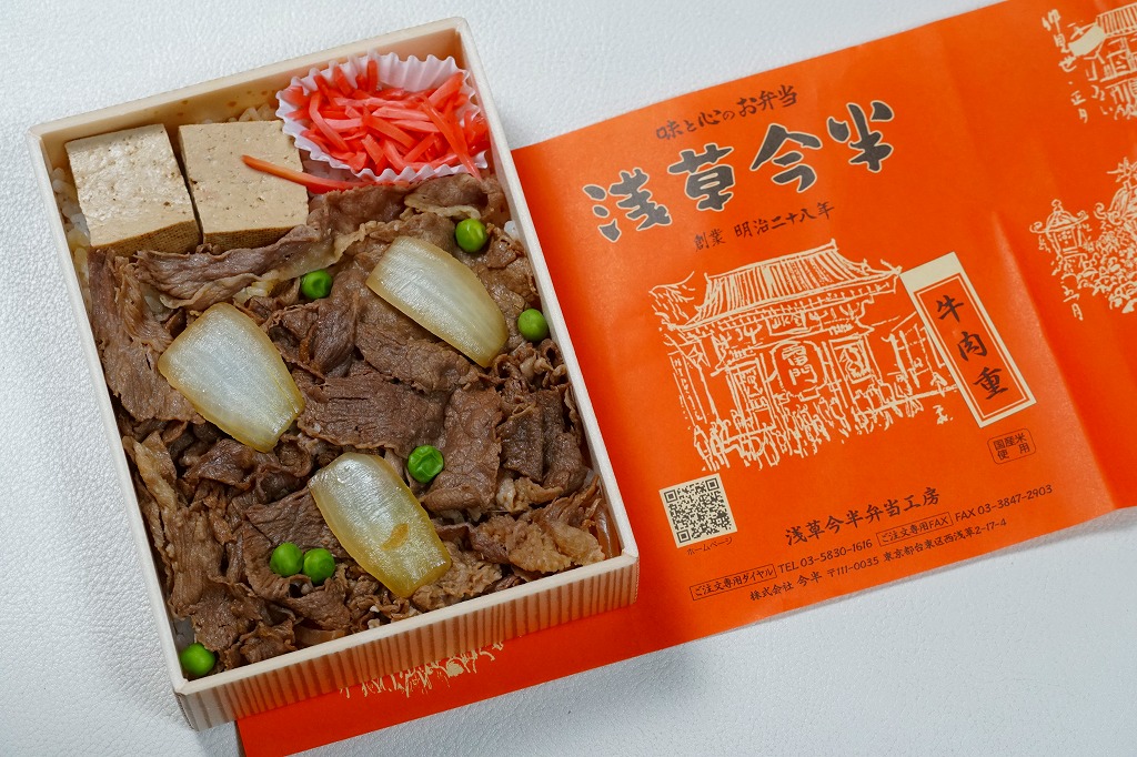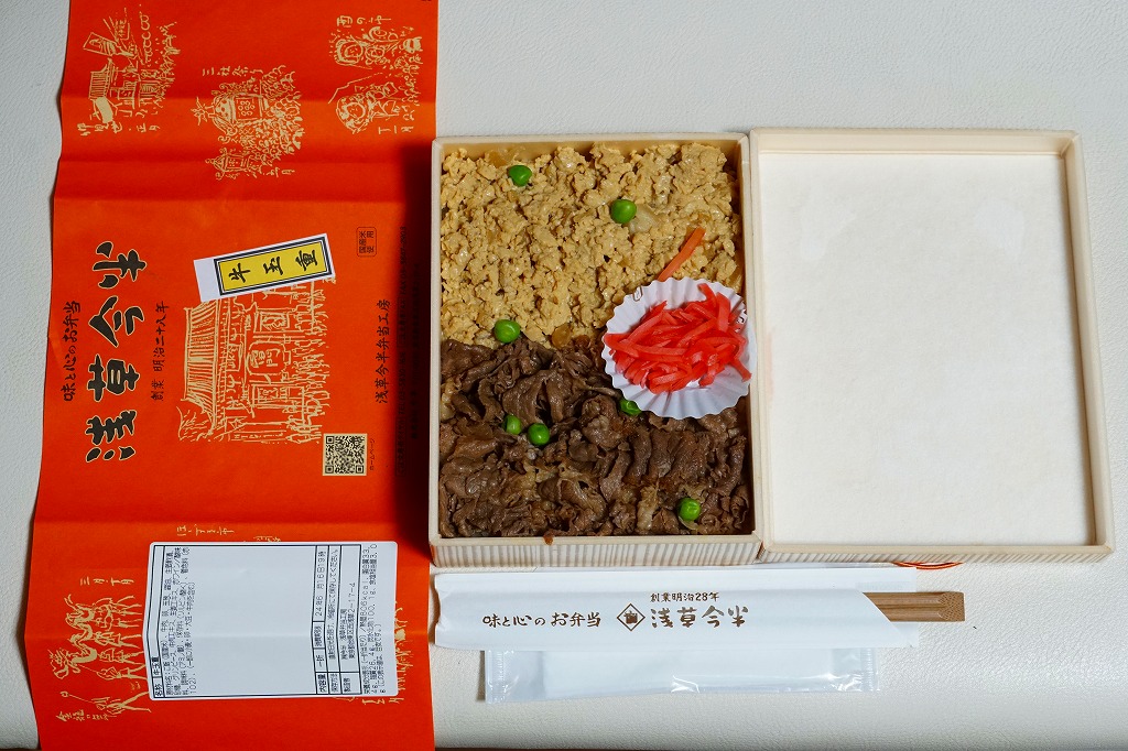 東京都心を中心に、日本中のデパートの食品売り場で売られる、浅草今半の牛肉弁当。東京駅や上野駅や羽田空港でも買え、浅草でも本店に加えて東武鉄道の浅草駅舎である松屋浅草店で購入できるが、2023年までに東武浅草駅の駅弁売店でも売られるようになった。浅草駅で「浅草今半」なので、浅草駅の駅弁に見えてくる。