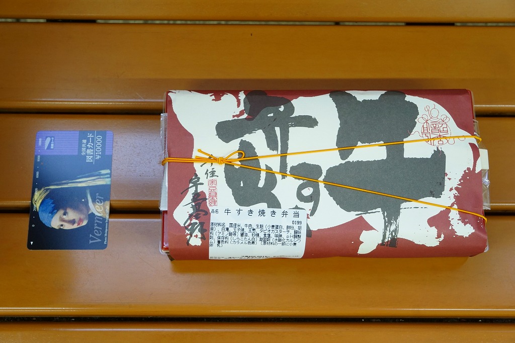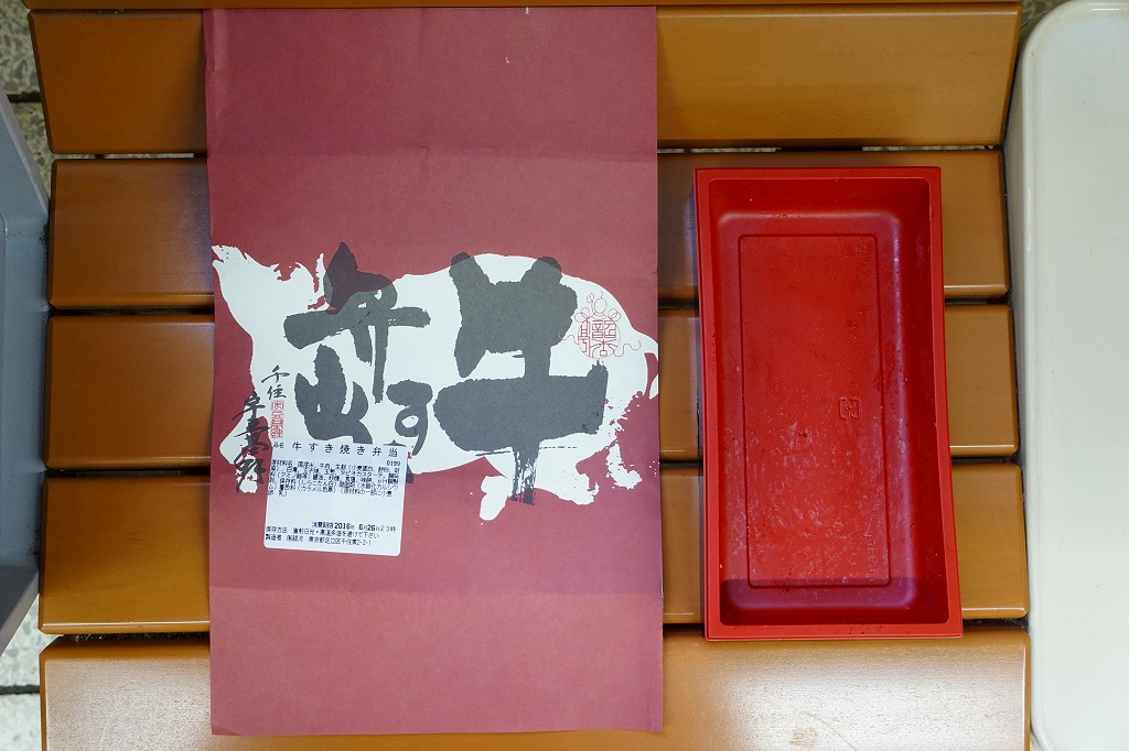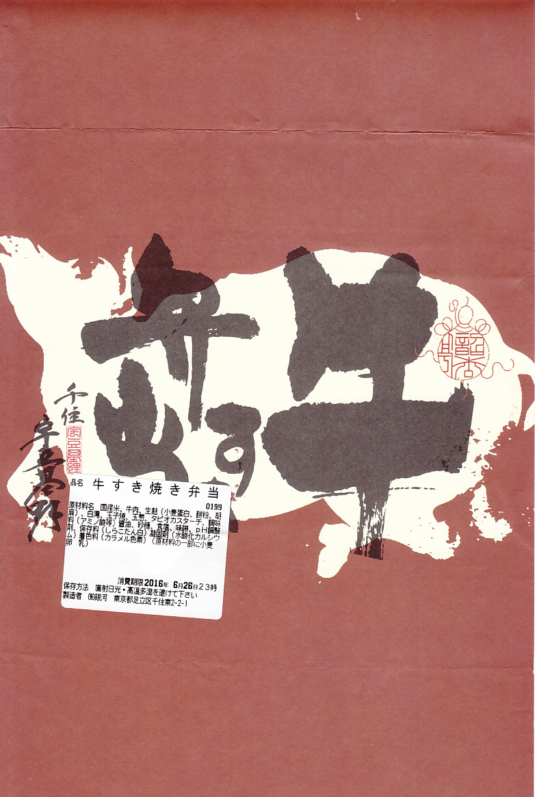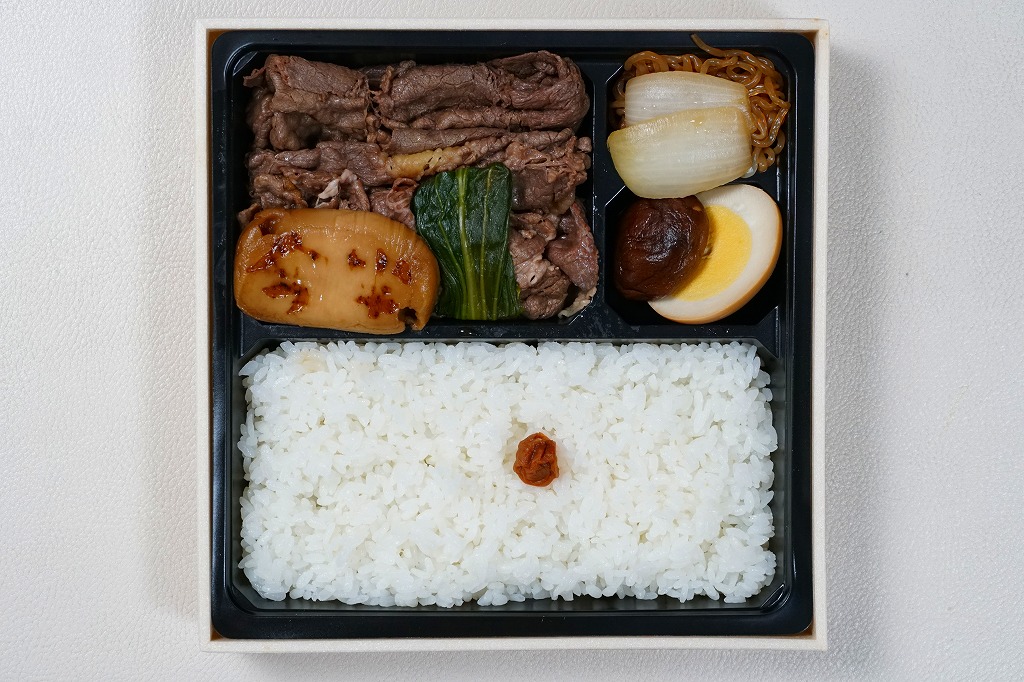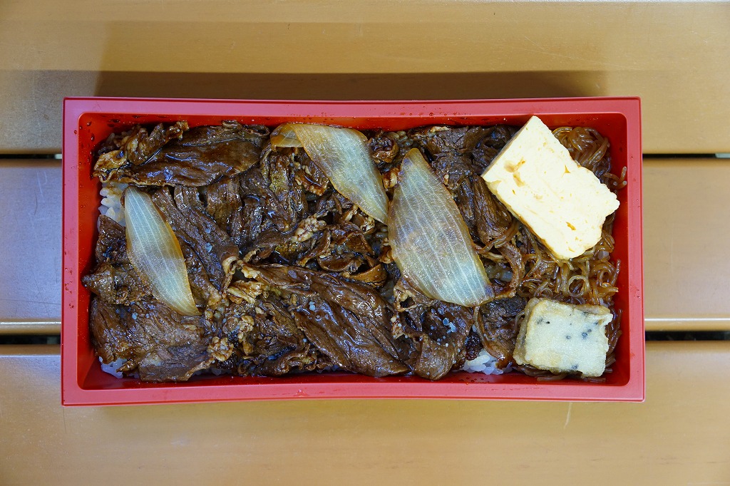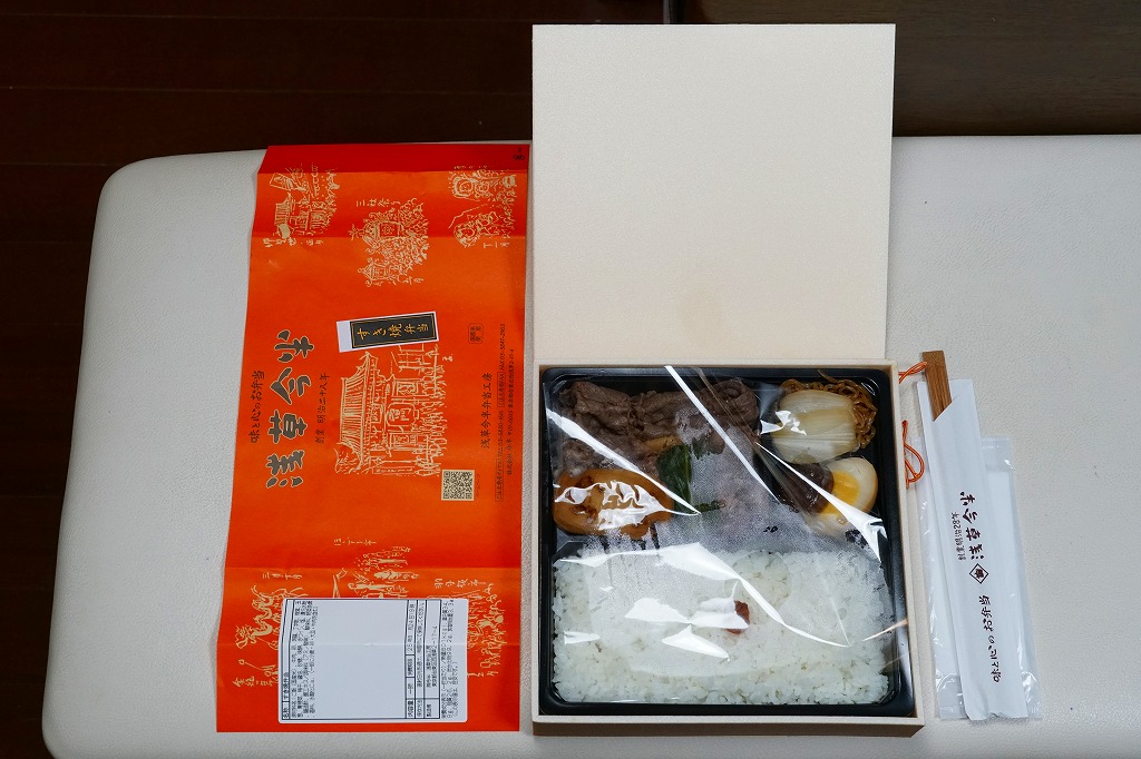 各種の商品で共通の掛紙に、これは「すき焼弁当」のシールを貼る。正方形の発泡材容器の、半分は日の丸御飯、半分はおかずで、牛肉煮と丁字麩と青梗菜、こんにゃくとタマネギとシイタケの煮物に煮玉子。薄手の牛肉の柔らかさと割り下が絶品な、見るからに高級な牛肉弁当。