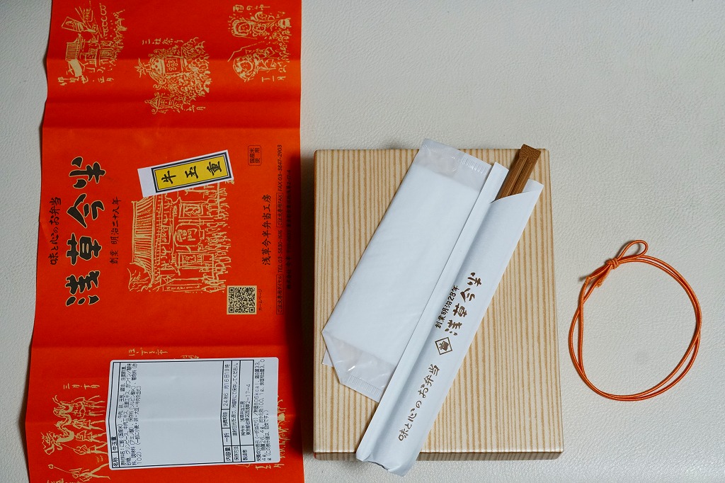 1963(昭和38)年の発売というが、浅草駅の駅弁売店に来たのは少なくとも2011(平成23)年以降、この名前や見栄えになったのは調製元のツイッターの情報によると2018(平成30)年3月からと思われる。ふたには浅草雷門や浅草の観光イベントが賑やかに描かれる。中身は茶飯を鶏そぼろときんぴらごぼうとごま昆布佃煮で覆い、チキンシュウマイ3個、玉子焼、タケノコとニンジンとコンニャクの煮物を添えるもの。飯も焼売もおかずも、JR駅の駅弁よりも水気があり柔らかくなっている。2022年1月に浅草駅と北千住駅の駅弁販売店が閉店し、すべての駅弁が終売となった。