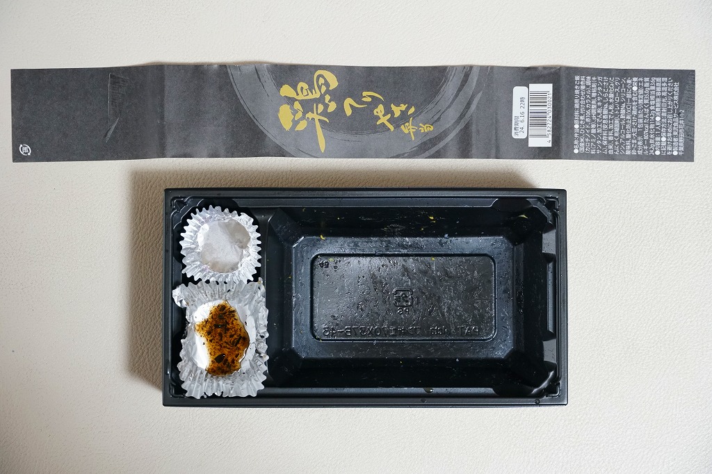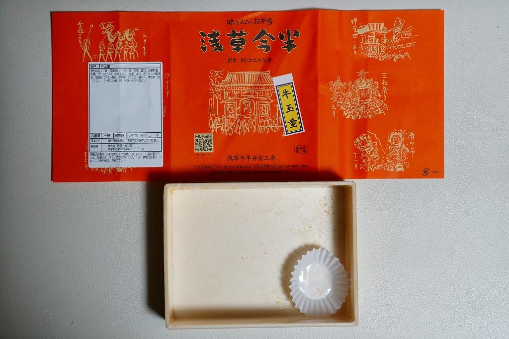 調製元の公式サイトによると、この牛玉重は配達専門のお弁当であり、店舗販売では楕円形の容器で1,242円の「牛玉弁当」となり、内容は同じでも調理方法等に違いがあるのだそうな。また、2024年6月の日本ロケ弁大賞・運営委員会主催「第1回 日本ロケ弁大賞」で、インターネット投票で集まった全265種類のロケ弁の中から金賞を受賞したというので、テレビ番組の収録時に出演者やスタッフなどに提供される仕出し弁当としてよく使われるのだろう。価格は2024年の購入時で1,080円、2025年4月から1,188円。牛玉弁当は1,512円に。