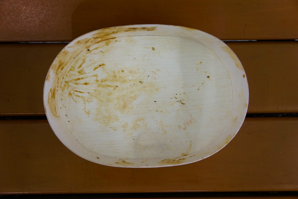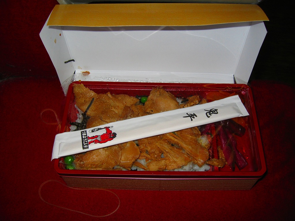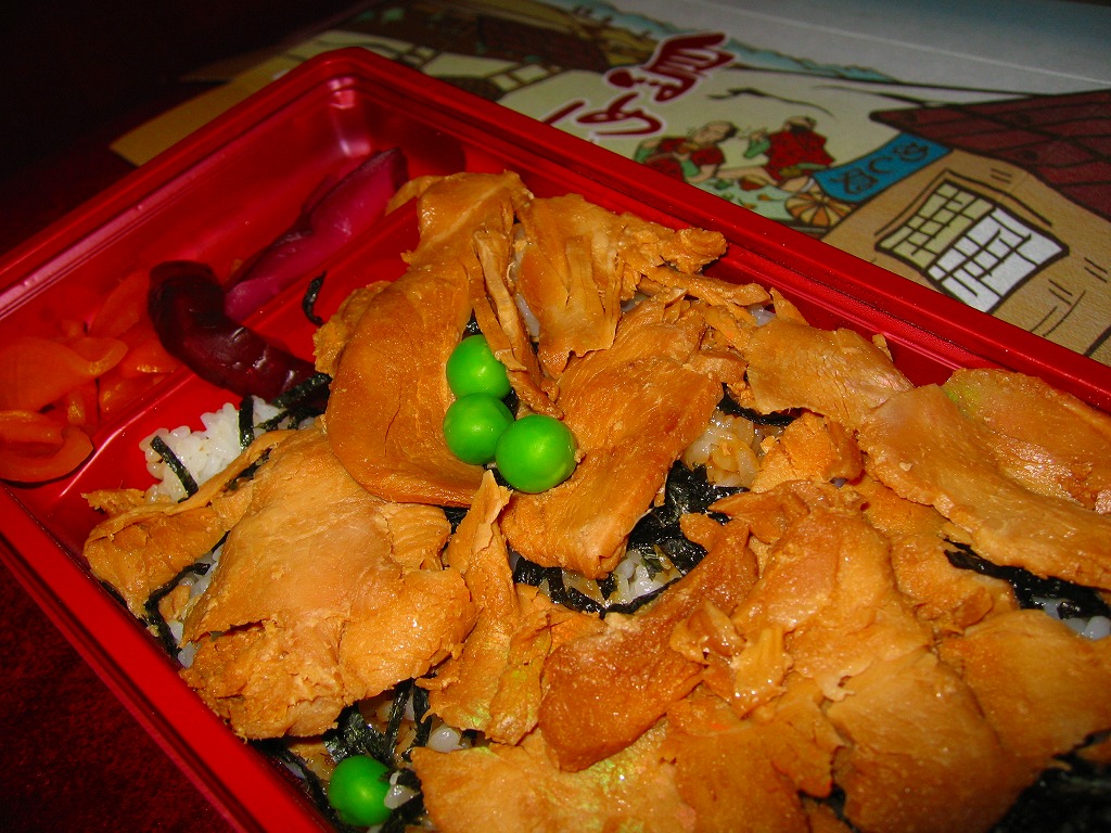 鳥飯など市販品では下手に作りようがない分野だと思う。しかしこの鳥肉板はパサパサで醤油臭く、彩りのためだけに散らしたグリーンピースで一般受けを削ぎ、雑に付けたタクアンとしば漬けの着色は毒々しい。こんな市販弁当が高度経済成長期までならともかく、平成の21世紀の首都ターミナル駅で現役なことに驚くばかり。掃除が行き届いていない電車内で、割り切りながらかき込んだ。