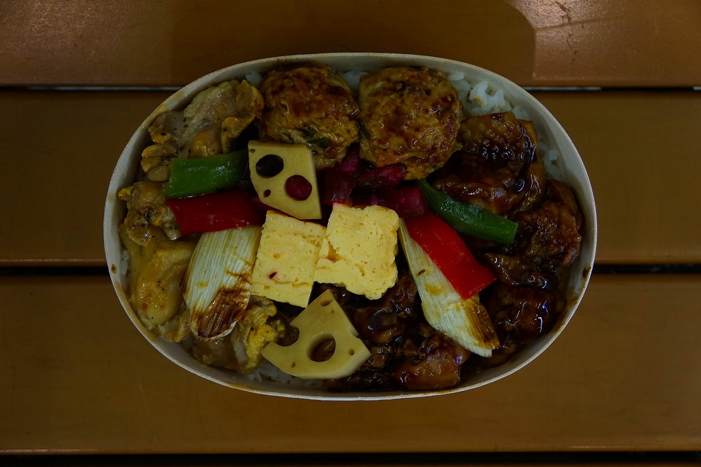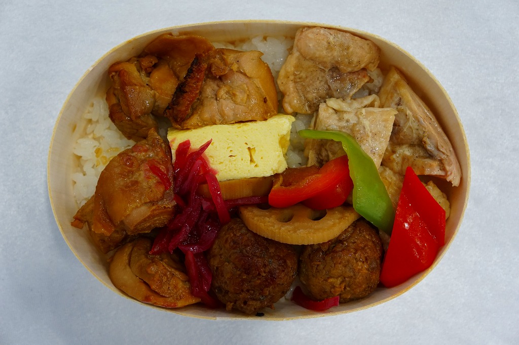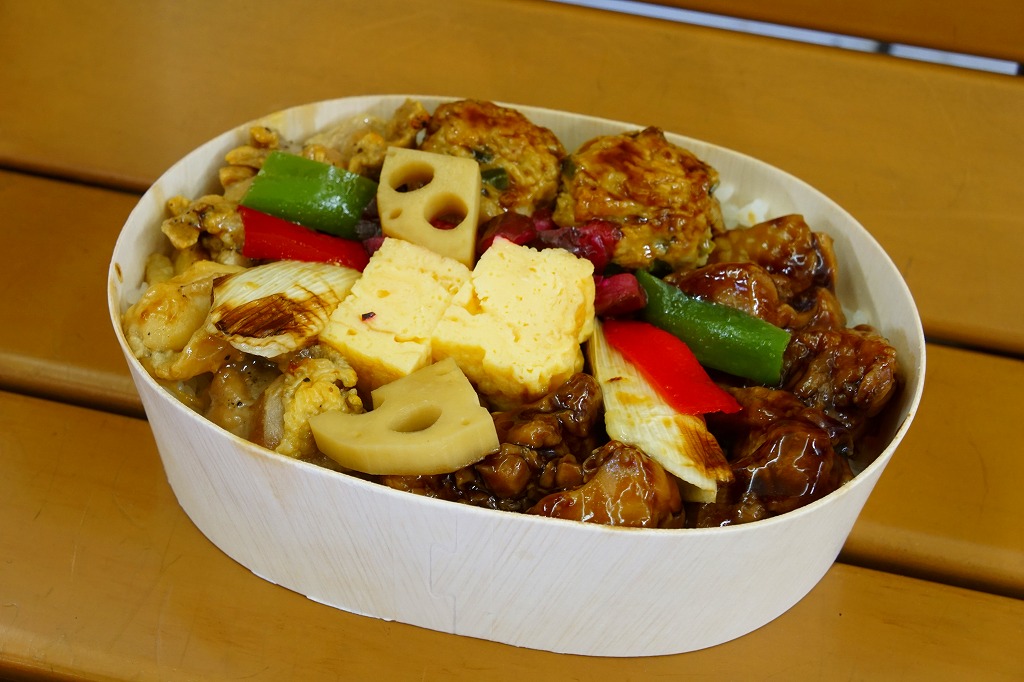東武浅草駅で駅弁も売る売店にて購入。わっぱ型の木製エコ容器の全面に白御飯を敷き詰め、焼き鳥や鶏肉団子をゴロゴロと撒いて外周を固め、長ネギ焼、レンコン、玉子焼、ピーマンなどを詰める。掛紙その他のパッケージがないため、コンビニ弁当か惣菜弁当にも見えるが、分量の多さ、容器の深さ、味の濃さ、常温での風味は、駅弁のそれである。鶏肉は分量に加えてタレの塩気や辛味の強さもあり、くどいほどの鶏丼。これはかつて「焼き鶏丼」の名で、浅草駅や北千住駅の駅弁として売られていたのではないかと思う。調製元の2017年頃の撤退により、今は売られていないはず。