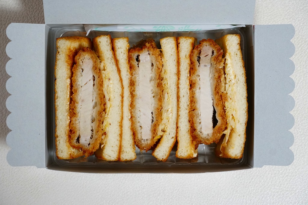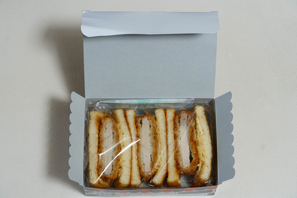 商品そのものは、その各地のものと同じ。1951年に浅草で創業した老舗の洋食店のブランドネームとキャラクターを描く専用の紙箱に、透明なプラ製トレーに収めてフィルムで密封したカツサンドが3切れ。焼いた食パンに豚ロースカツのソース漬けと自家製コールスローを挟む。ほどほどに柔らかく歯応えのあるカツサンドだと思う。コンビニサンドとこういった商品の進出により、昔からの駅弁屋は2000年代にはほとんどサンドイッチを作らなくなった。この商品の調製元は羽田空港の空弁屋。