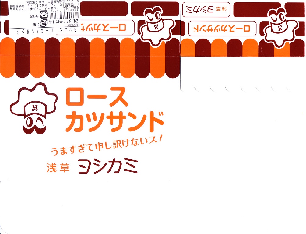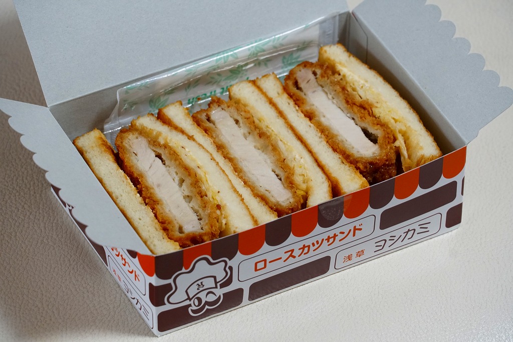 羽田空港の空弁売り場や、東京駅や上野駅などの駅弁売店「膳まい」改め「HANAGATAYA」でおなじみの、浅草ヨシカミのロースカツサンド。2023年までに東武浅草駅の駅弁売店でも売られるようになった。浅草駅で「浅草ヨシカミ」なので、浅草駅の駅弁に見えてくる。