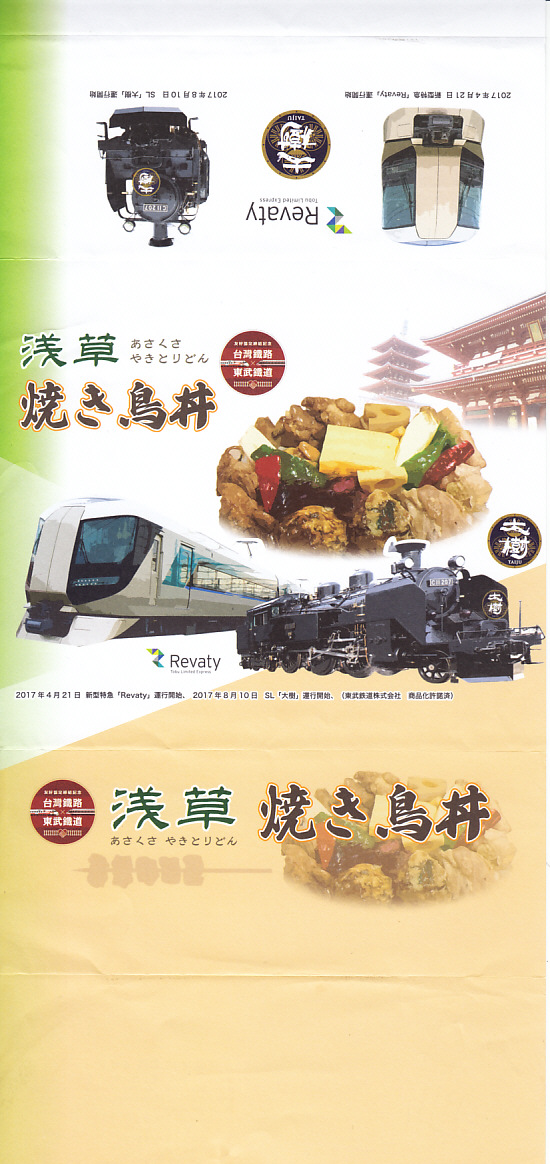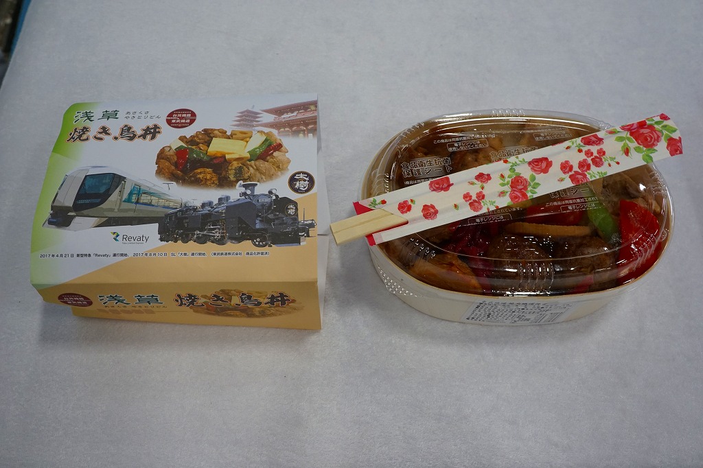 東武鉄道は、この1種。内容も分量も容器もおおむね、浅草駅弁「焼き鳥丼」と同じ。これに、中身と浅草寺と特急電車「リバティ」とSL列車「大樹」の写真を載せた掛紙をかけて販売していた。後に浅草駅の駅弁にも、この掛紙と似たものをかけ始めたらしい。ここでの調製元は、台北市内の歓楽街にある日本人向けの海鮮居酒屋。