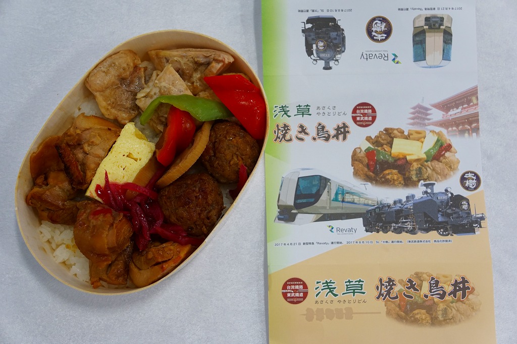 2023(令和5)年までに東武鉄道の浅草駅で発売か。商品名を書いた黒い紙帯を締める、長方形のプラ容器に白飯を詰め、錦糸卵で覆い、タレをまとう鶏照焼のひとかたまりを5切れにカットして載せ、ピーマン焼きで彩り、ひじき煮と大根桜漬を添える。デパ地下の惣菜弁当のようなもの。調製元とその所在地から、東武鉄道系列のゴルフ場その他施設で食堂や売店を運営する東武鉄道の子会社が、千葉県野田市で運営するホテル「ビジネスホテル野田」で製造する弁当だろうか。駅のホーム上でそば・うどんでなく立ち食いラーメンを提供することで鉄道ファンに驚かれる「東武らーめん」の運営元でもある。
