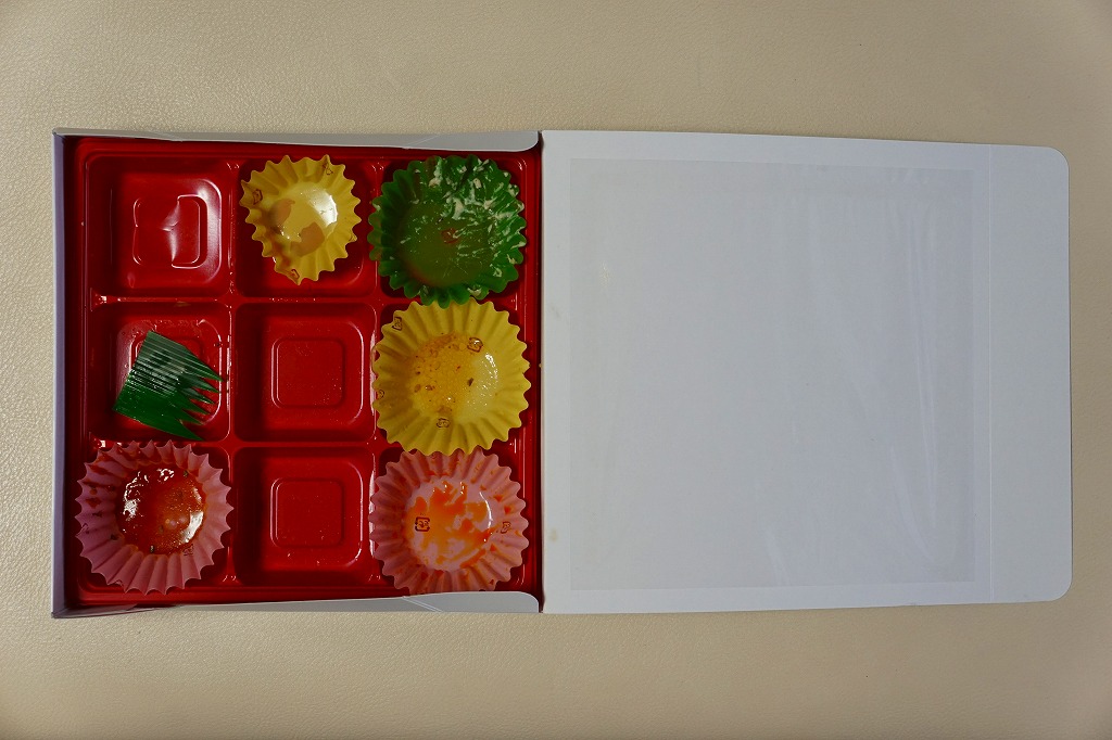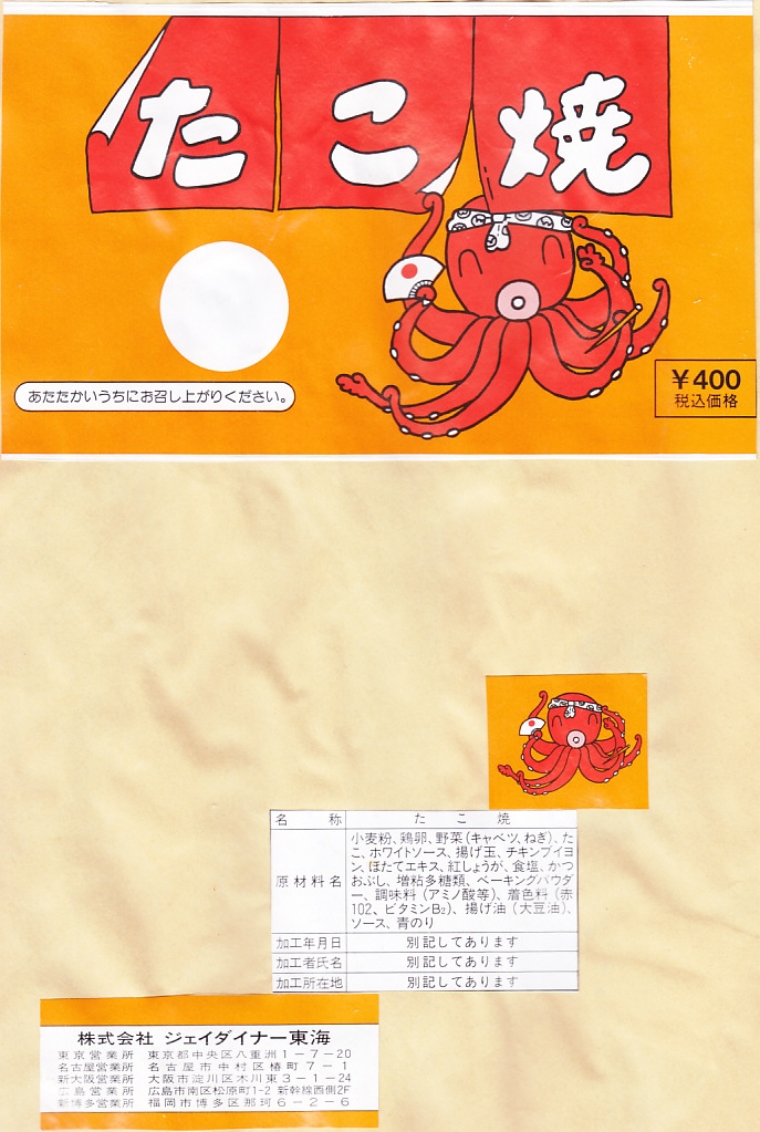 入手状況から1992(平成4)年頃のものと思われる、昔の東海道新幹線車内商品の紙箱の一部。0系新幹線電車の「ひかり」や「こだま」の車内で販売された商品で、プラ製トレーに収まるチルドのたこ焼きを電子レンジで加熱して、この紙箱に収めてビュフェで提供したり、列車内で売り歩いた。同じような商品に焼売があり、「たこ、しゅう」と呼べば当時の社員やメイツ(アルバイト)が懐かしむと思う。調製元は東京、名古屋、新大阪、広島、新博多の5営業所の連名。
