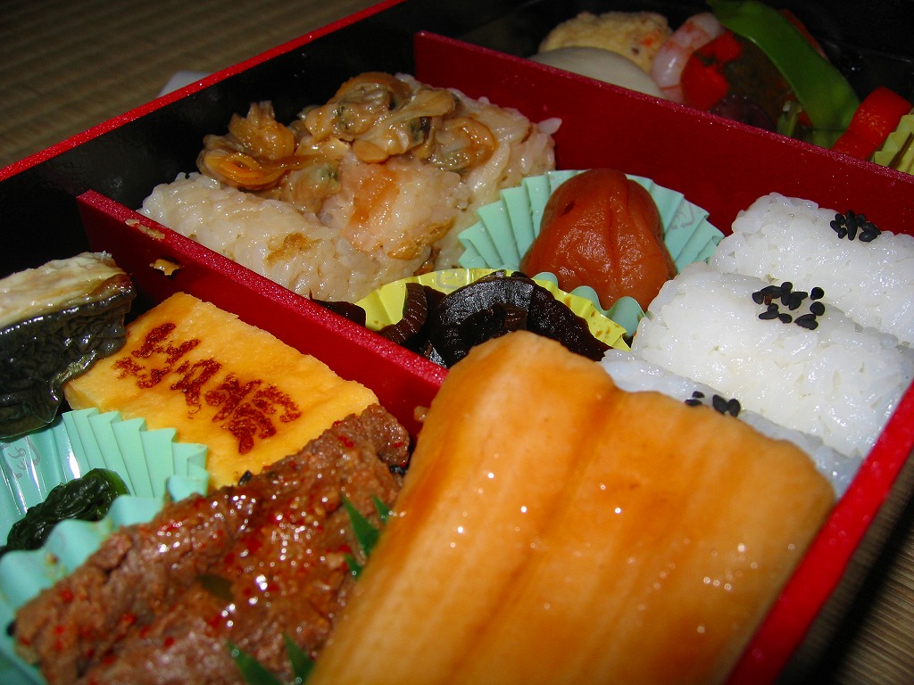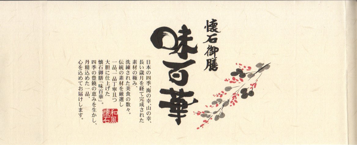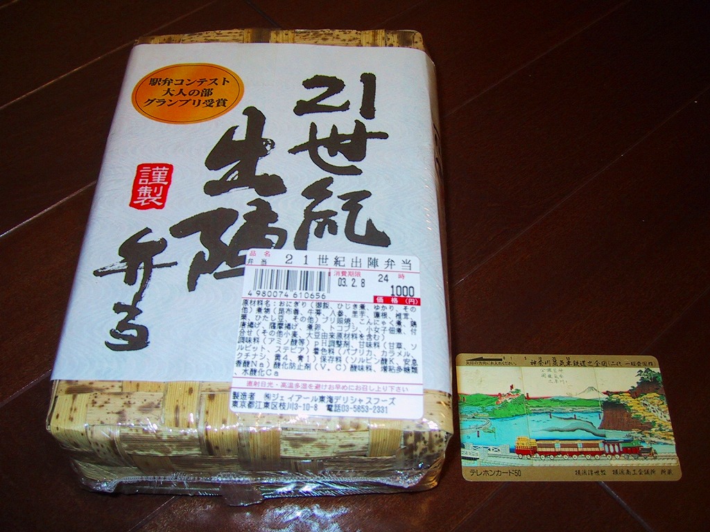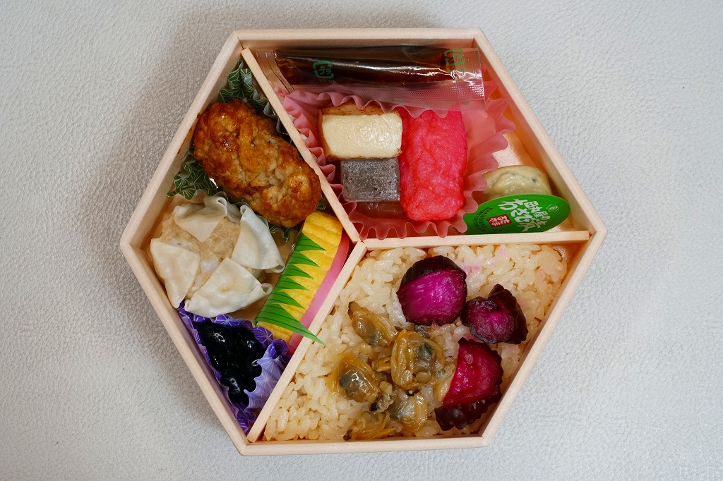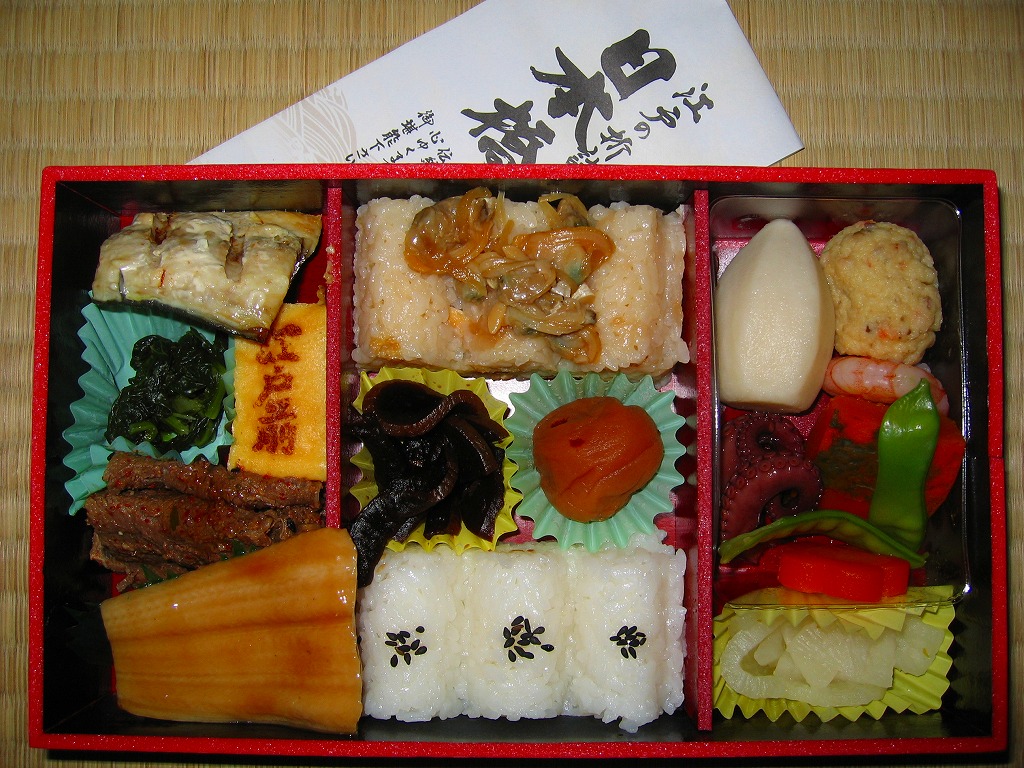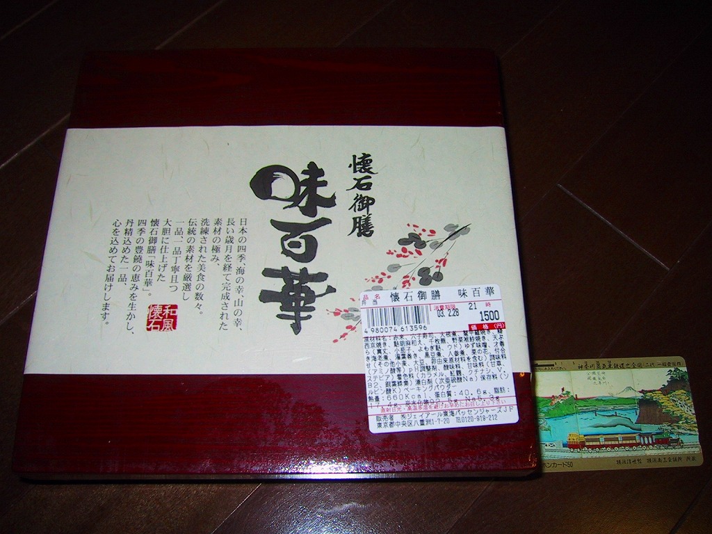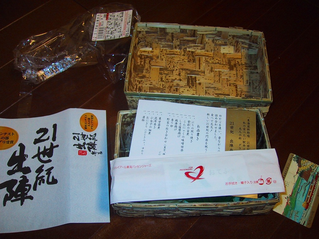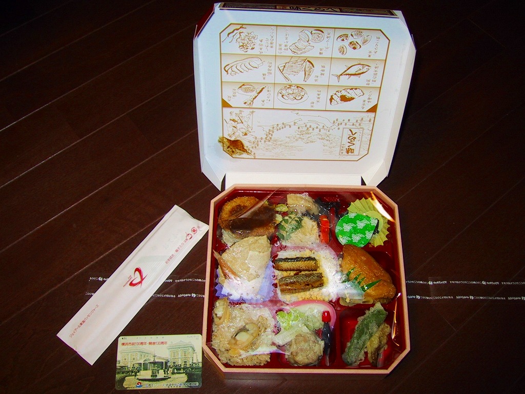 2003(平成15)年1月9日に発売した、東京駅と新横浜駅の東海道新幹線駅の改札内で販売されるお弁当。割烹・料亭のお弁当をイメージしたそうで、手触りまで漆塗り木箱を模した容器を使用、中身は煮物として大根柚子味噌や湯葉など、焼八寸として鰆西京焼や穴子棒寿司など、合肴としてカニ甲羅焼やナスなどの揚げ物、御食事として赤米混じり扇形御飯が入る。お品書きは漢字の羅列で、リストと中身を照らし合わせる作業も楽しいお弁当は、京都へ行く新幹線のグリーン車が似合いそう。あまり長くは売られなかった模様