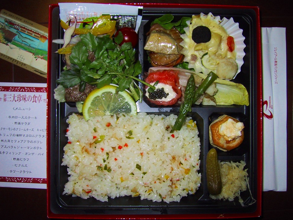 2003(平成15)年1月9日に発売した、東京駅と新横浜駅の東海道新幹線駅の改札内で販売されるお弁当。洋食卓をイメージした皿とナイフ・フォークのイラストを描くボール紙の箱を使用、中身は駅弁の名前どおり「スモークサーモンのクリームチーズキャビア添え」「黒トリュフの海鮮マカロニグラタン」「帆立貝とフォアグラのポワレ」と世界三大珍味のすべてが入り、他はピラフや牛ロースステーキやジャーマンポテトなどという洋風駅弁。メインの三大珍味はさすがに少量であるものの風味や食感を感じられるサイズは確保されており、これを除いても高級を名乗れる品質の高い駅弁。登場時には新聞やテレビで話題になった。2003年4月現在で一日200個を販売する。2004年までの販売か。