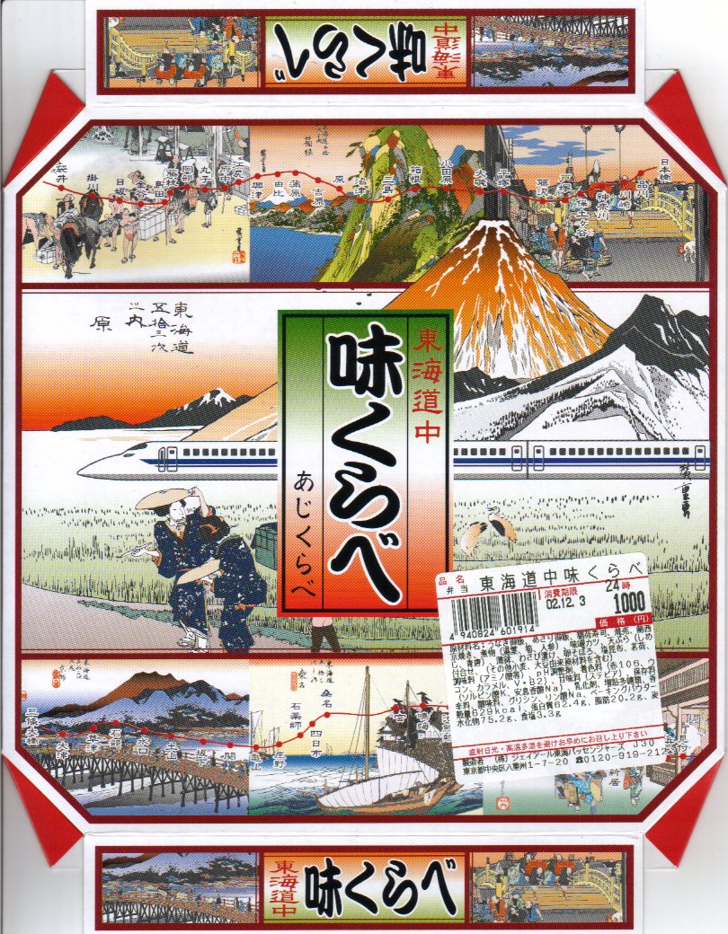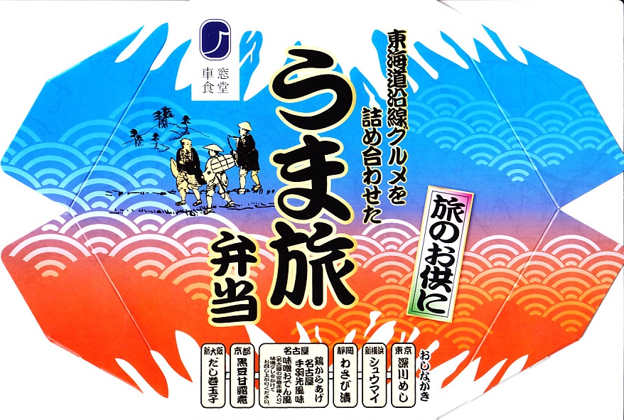 広重の東海道五十三次の絵をちりばめたパッケージ。中身はその裏面に記され、東京のあさりご飯、横浜のポーク焼売、小田原の鈴廣かまぼこ、三島のわさび漬け、静岡の鮪の西京焼き、浜松の鰻御飯、豊橋の稲荷寿司、名古屋の味噌カツ、岐阜羽島のしめじと青唐の天ぷら、京都の京風煮物、大阪の塩昆布という具合に、東海道新幹線沿線の名物11種類が9区画のトレーに収まっている、東海道新幹線車内販売限定のお弁当。購入すると鉄観音茶がもらえる。だいぶ前に売り止めた模様。